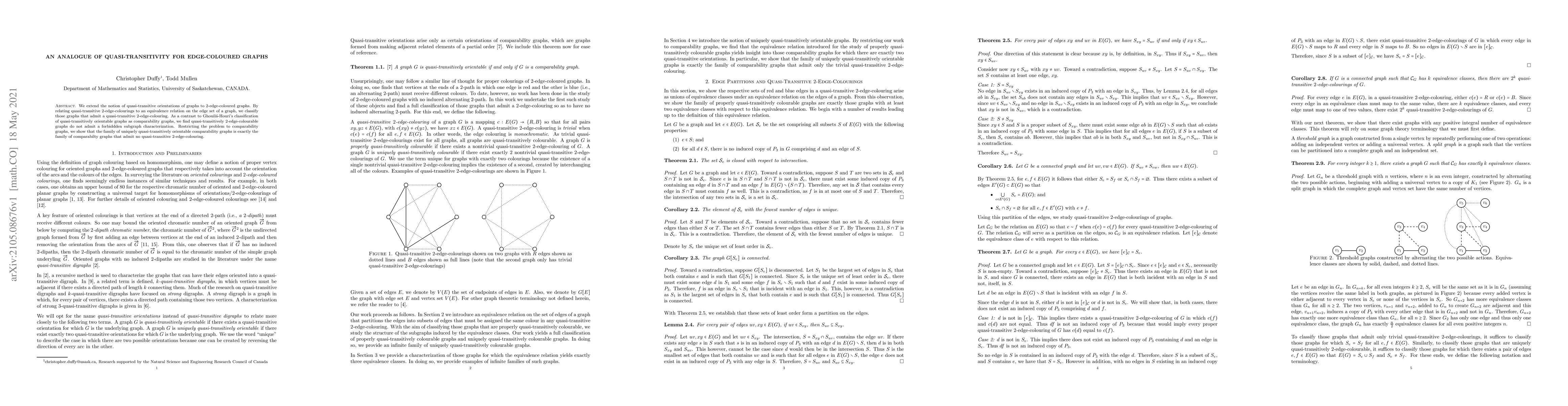 This paper extends the concept of quasi-transitive orientations to 2-edge-coloured graphs, classifying those that allow quasi-transitive 2-edge-colourings without a forbidden subgraph characterization. It contrasts with previous classifications for comparability graphs and identifies uniquely quasi-transitively orientable comparability graphs that do not admit quasi-transitive 2-edge-colourings.