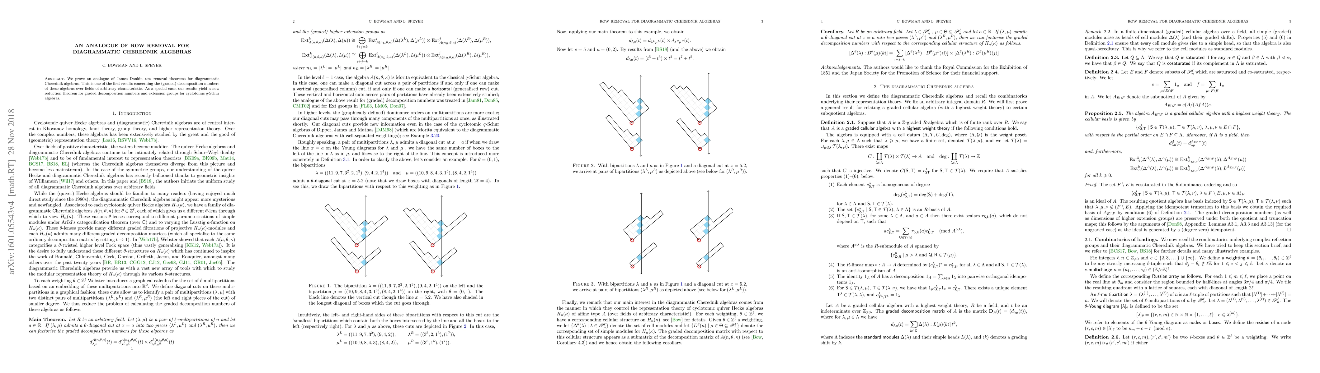 This paper proves an analogue of row removal theorems for diagrammatic Cherednik algebras, contributing to the understanding of their graded decomposition numbers across various characteristics. As a special case, the results provide a new reduction theorem for cyclotomic q-Schur algebras.