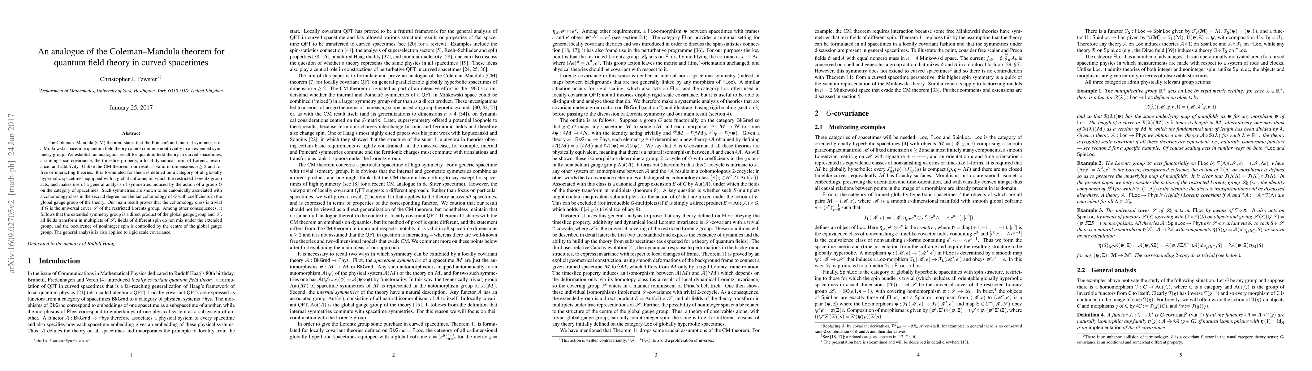 The Coleman-Mandula (CM) theorem states that the Poincar\'e and internal symmetries of a Minkowski spacetime quantum field theory cannot combine nontrivially in an extended symmetry group. We establish an analogous result for quantum field theory in curved spacetimes, assuming local covariance, the timeslice property, a local dynamical form of Lorentz invariance, and additivity. Unlike the CM theorem, our result is valid in dimensions $n\ge 2$ and for free or interacting theories. It is formulated for theories defined on a category of all globally hyperbolic spacetimes equipped with a global coframe, on which the restricted Lorentz group acts, and makes use of a general analysis of symmetries induced by the action of a group $G$ on the category of spacetimes. Such symmetries are shown to be canonically associated with a cohomology class in the second degree nonabelian cohomology of $G$ with coefficients in the global gauge group of the theory. Our main result proves that the cohomology class is trivial if $G$ is the universal cover $\cal S$ of the restricted Lorentz group. Among other consequences, it follows that the extended symmetry group is a direct product of the global gauge group and $\cal S$, all fields transform in multiplets of $\cal S$, fields of different spin do not mix under the extended group, and the occurrence of noninteger spin is controlled by the centre of the global gauge group. The general analysis is also applied to rigid scale covariance.