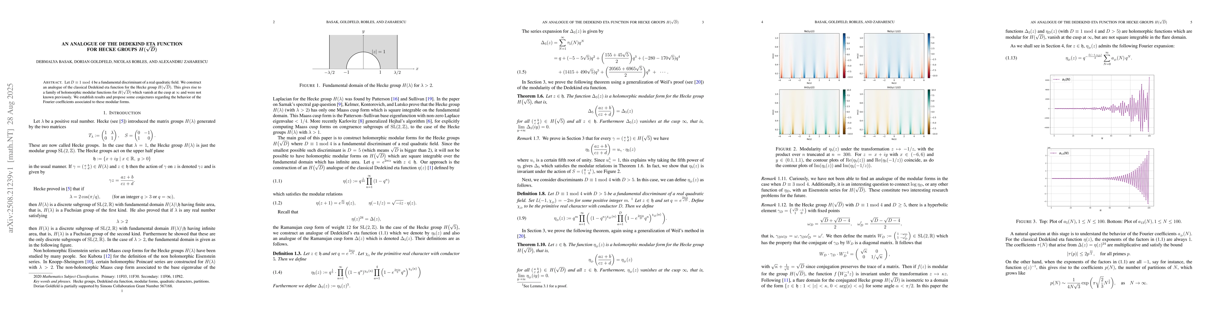 Let $D\equiv 1\bmod{4}$ be a fundamental discriminant of a real quadratic field. We construct an analogue of the classical Dedekind eta function for the Hecke group $H(\sqrt{D})$. This gives rise to a family of holomorphic modular functions for $H(\sqrt{D})$ which vanish at the cusp at $\infty$ and were not known previously. We establish results and propose some conjectures regarding the behavior of the Fourier coefficients associated to these modular forms.