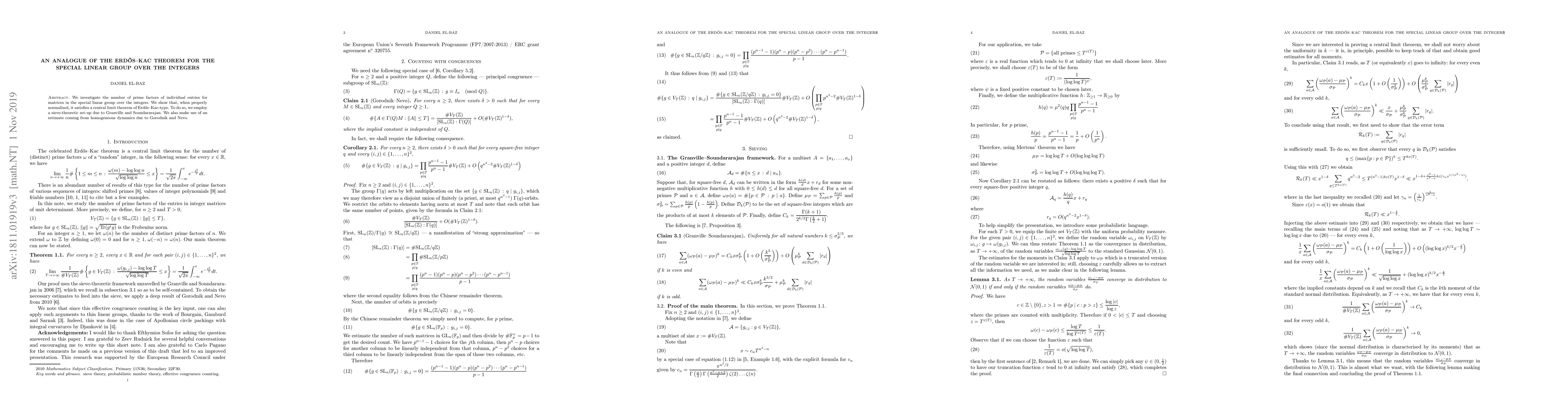 We investigate the number of prime factors of individual entries for matrices in the special linear group over the integers. We show that, when properly normalised, it satisfies a central limit theorem of Erd\H{o}s-Kac-type. To do so, we employ a sieve-theoretic set-up due to Granville and Soundararajan. We also make use of an estimate coming from homogeneous dynamics due to Gorodnik and Nevo.