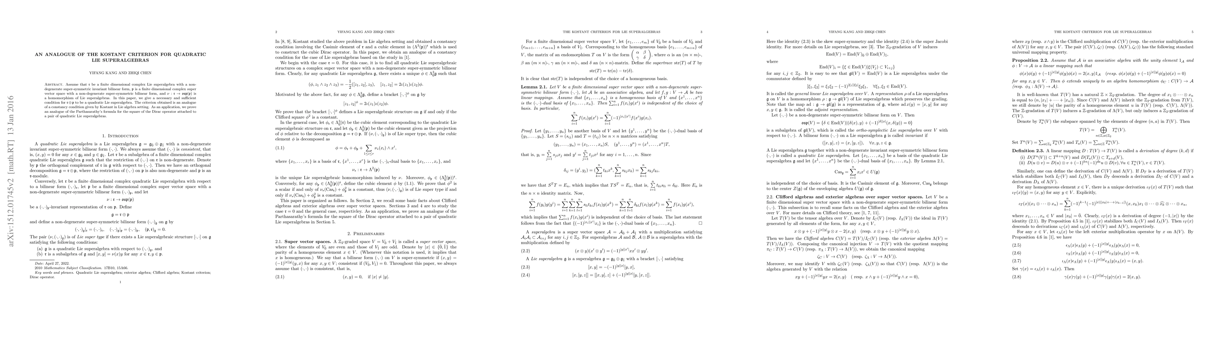 This paper establishes a necessary and sufficient condition for the direct sum of a finite-dimensional complex Lie superalgebra and a super vector space to form a quadratic Lie superalgebra, analogous to Kostant's criterion for Lie algebras. The result is applied to derive an analogue of Parthasarathy's formula for the square of the Dirac operator in this context.