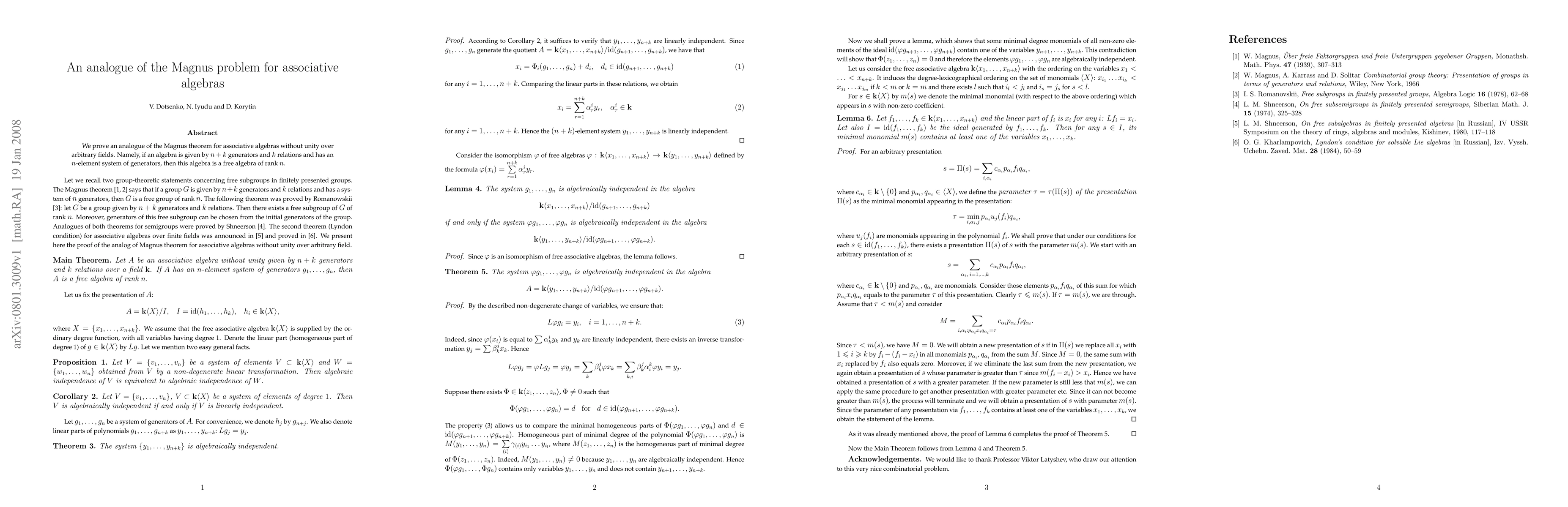 We prove an analogue of the Magnus theorem for associative algebras without unity over arbitrary fields. Namely, if an algebra is given by n+k generators and k relations and has an n-element system of generators, then this algebra is a free algebra of rank n.