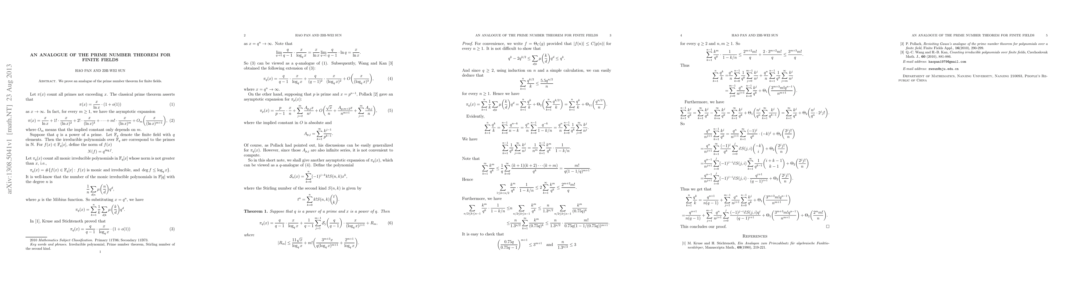 Summary: This paper establishes an analogue of the prime number theorem for finite fields, providing insights into the distribution of prime elements within these mathematical structures. The findings extend classical number theory results to the realm of finite fields.