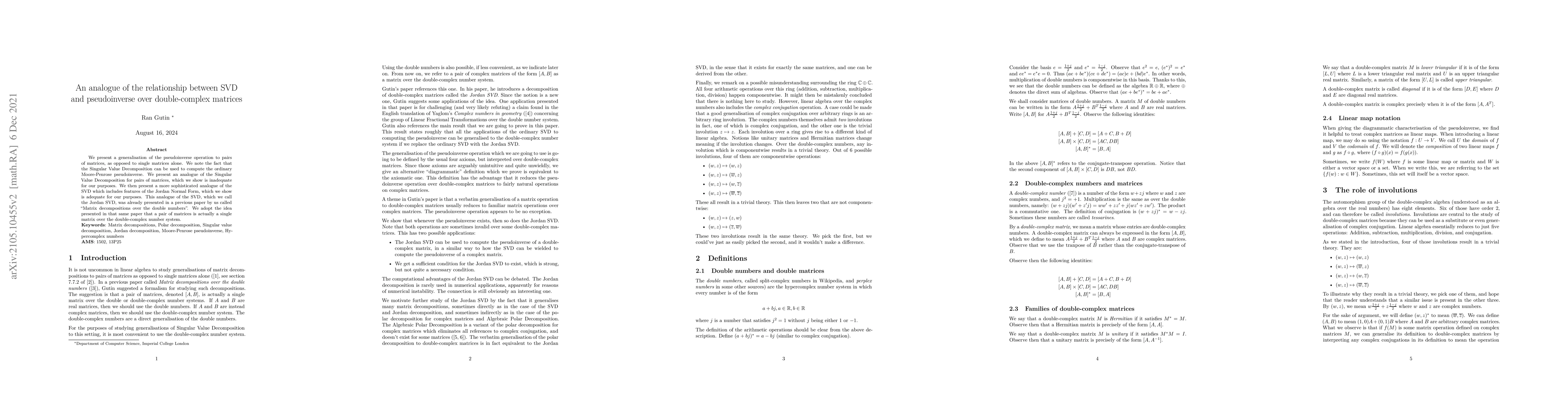 This paper generalizes the pseudoinverse to pairs of matrices and introduces a Jordan SVD analogue for double-complex matrices, which incorporates features from the Jordan Normal Form and is shown to be suitable for computing the pseudoinverse for matrix pairs. This method builds on prior work presenting the Jordan SVD in the context of double numbers.