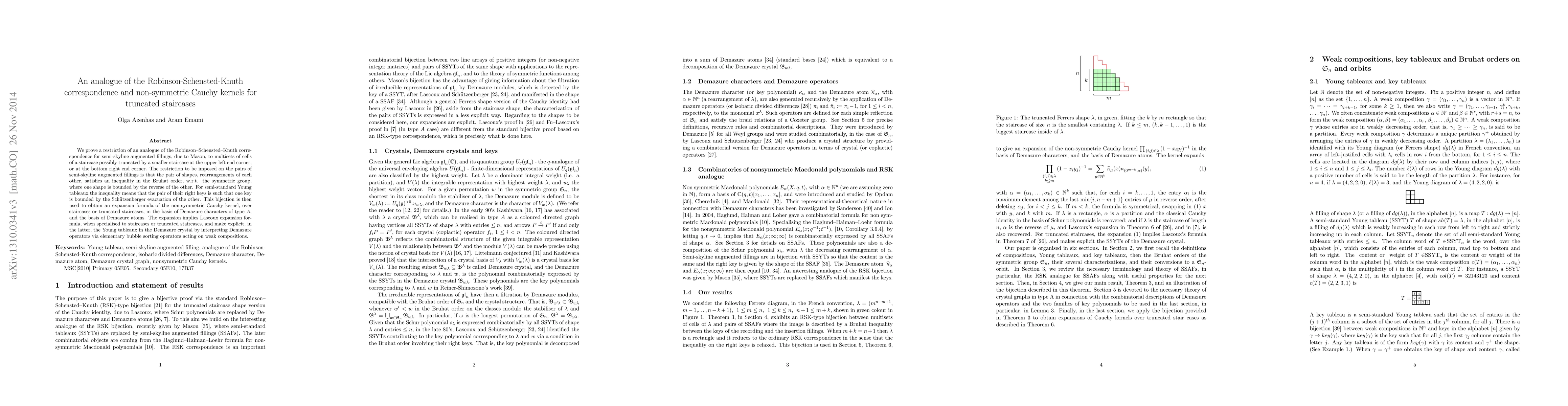 We prove a restriction of an analogue of the Robinson--Schensted--Knuth correspondence for semi-skyline augmented fillings, due to Mason, to multisets of cells of a staircase possibly truncated by a smaller staircase at the upper left end corner, or at the bottom right end corner. The restriction to be imposed on the pairs of semi-skyline augmented fillings is that the pair of shapes, rearrangements of each other, satisfies an inequality in the Bruhat order, w.r.t. the symmetric group, where one shape is bounded by the reverse of the other. For semi-standard Young tableaux the inequality means that the pair of their right keys is such that one key is bounded by the Sch\"utzenberger evacuation of the other. This bijection is then used to obtain %recover an expansion formula of the non-symmetric Cauchy kernel, over staircases or truncated staircases, in the basis of Demazure characters of type $A$, and the basis of Demazure atoms. The expansion implies Lascoux expansion formula, when specialised to staircases or truncated staircases, and make explicit, in the latter, the Young tableaux in the Demazure crystal by interpreting Demazure operators via elementary bubble sorting operators acting on weak compositions.