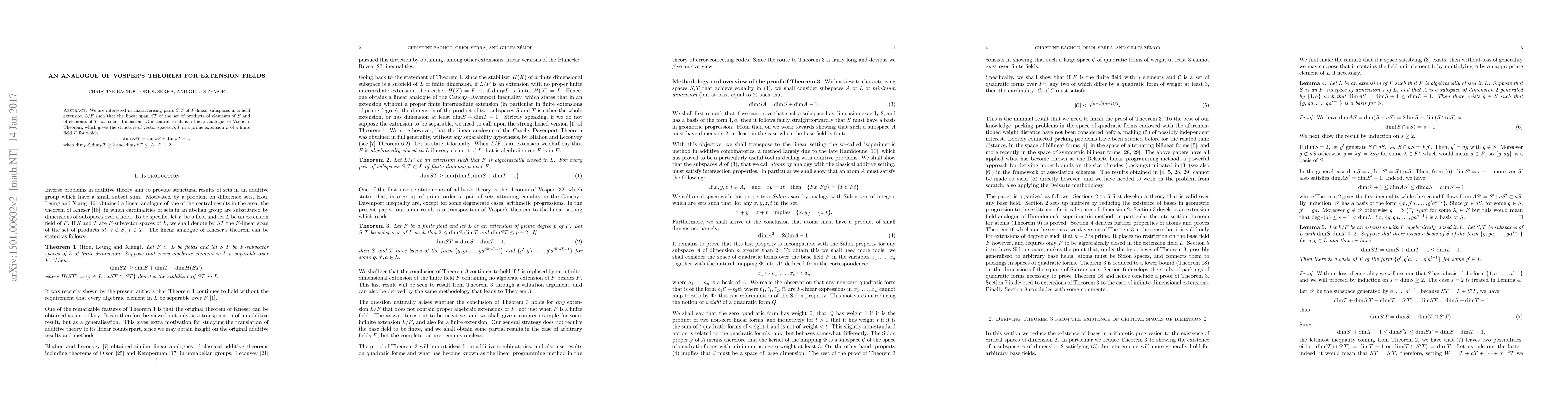 This paper characterizes pairs of $F$-linear subspaces $S$ and $T$ in a field extension $L/F$ such that their linear span $ST$ has a small dimension. The central result is a linear analogue of Vosper's Theorem for prime extensions, providing the structure of $S$ and $T$ when $\dim_FST = \dim_F S + \dim_F T - 1$ under certain conditions.