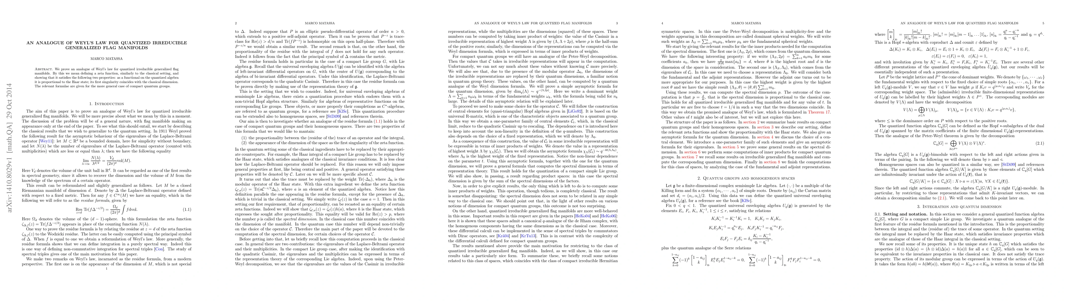 This paper establishes an analogue of Weyl's law for quantized irreducible generalized flag manifolds by defining a zeta function and proving it is proportional to the Haar state, with its first singularity matching the classical dimension. The findings are applicable in the broader context of compact quantum groups.