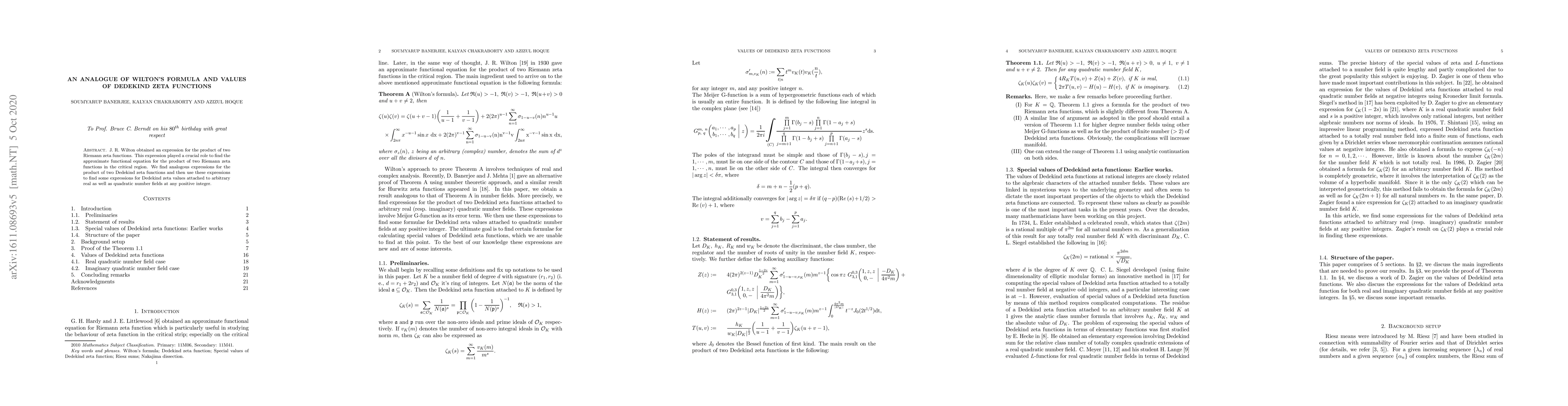 J. R. Wilton obtained an expression for the product of two Riemann zeta functions. This expression played a crucial role to find the approximate functional equation for the product of two Riemann zeta functions in the critical region. We find analogous expressions for the product of two Dedekind zeta functions and then use these expressions to find some expressions for Dedekind zeta values attached to arbitrary real as well as quadratic number fields at any positive integer.