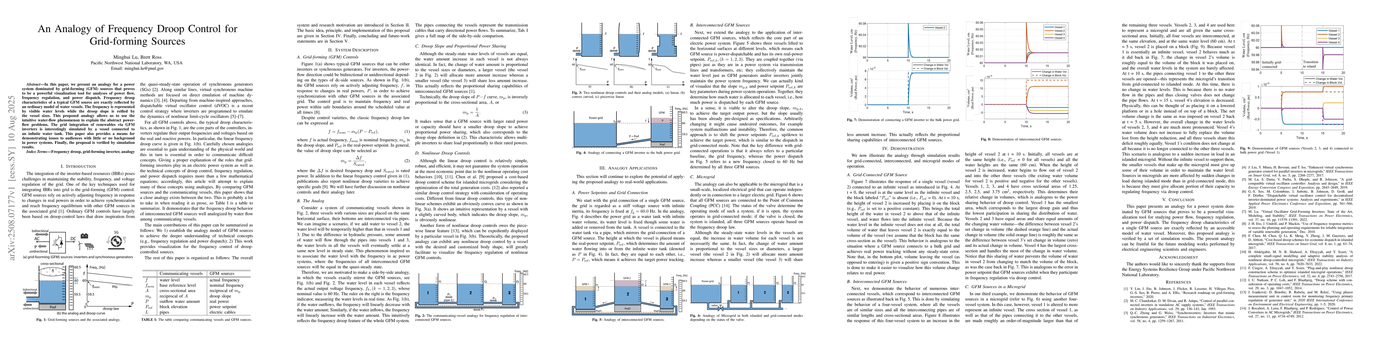 The paper proposes an analogy using communicating vessels to represent grid-forming sources, illustrating power flow, frequency regulation, and power dispatch. This analogy is verified through simulation results.