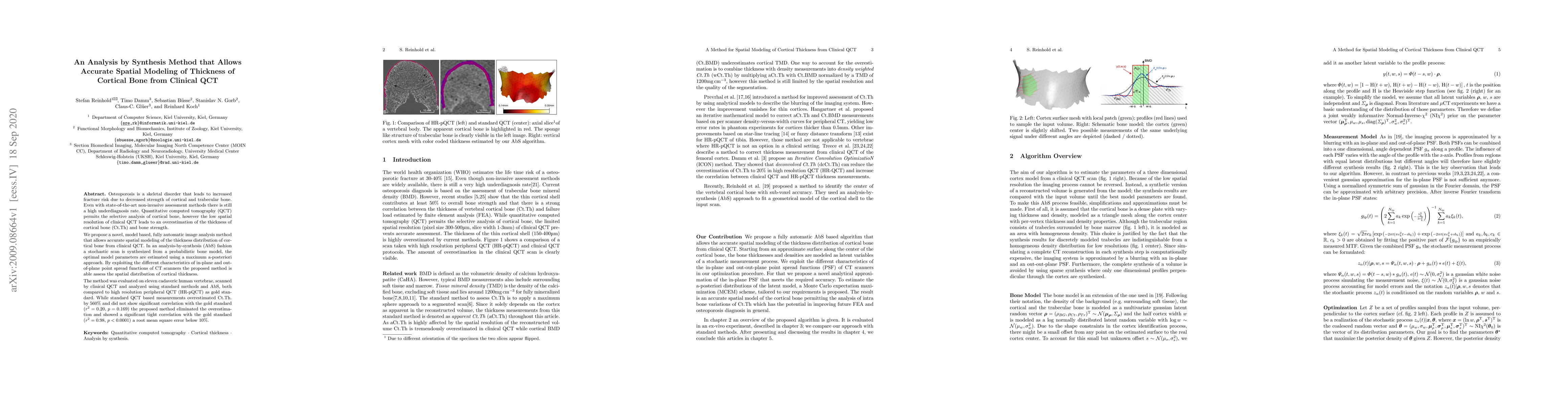 Osteoporosis is a skeletal disorder that leads to increased fracture risk due to decreased strength of cortical and trabecular bone. Even with state-of-the-art non-invasive assessment methods there is still a high underdiagnosis rate. Quantitative computed tomography (QCT) permits the selective analysis of cortical bone, however the low spatial resolution of clinical QCT leads to an overestimation of the thickness of cortical bone (Ct.Th) and bone strength. We propose a novel, model based, fully automatic image analysis method that allows accurate spatial modeling of the thickness distribution of cortical bone from clinical QCT. In an analysis-by-synthesis (AbS) fashion a stochastic scan is synthesized from a probabilistic bone model, the optimal model parameters are estimated using a maximum a-posteriori approach. By exploiting the different characteristics of in-plane and out-of-plane point spread functions of CT scanners the proposed method is able assess the spatial distribution of cortical thickness. The method was evaluated on eleven cadaveric human vertebrae, scanned by clinical QCT and analyzed using standard methods and AbS, both compared to high resolution peripheral QCT (HR-pQCT) as gold standard. While standard QCT based measurements overestimated Ct.Th. by 560% and did not show significant correlation with the gold standard ($r^2 = 0.20,\, p = 0.169$) the proposed method eliminated the overestimation and showed a significant tight correlation with the gold standard ($r^2 = 0.98,\, p < 0.0001$) a root mean square error below 10%.