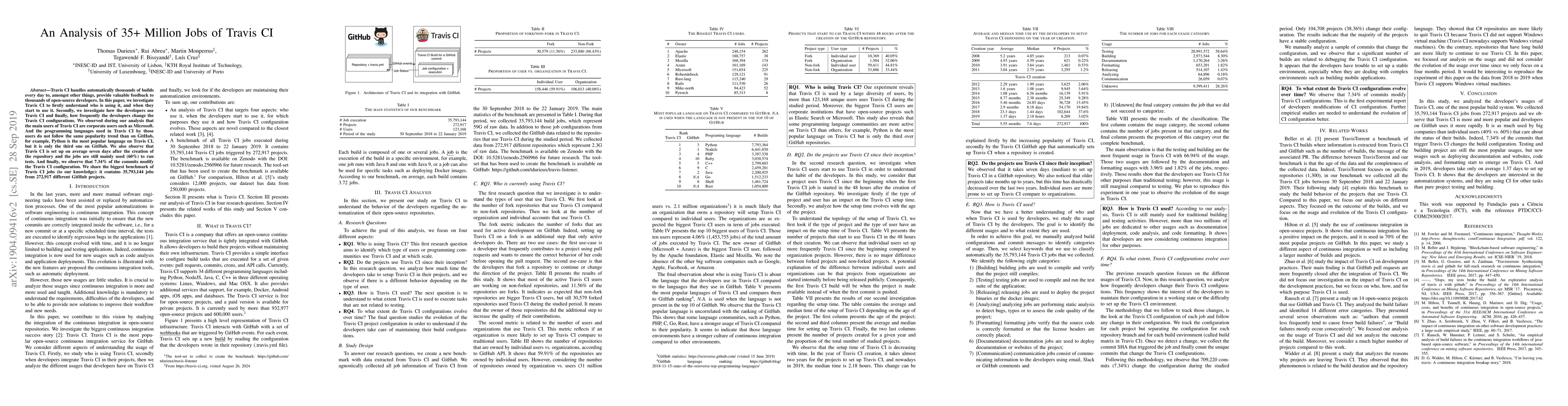 This paper analyzes over 35 million Travis CI jobs to understand user demographics, usage patterns, and configuration changes. It finds that corporate users like Microsoft dominate, with Python being the most popular language on Travis CI despite differing trends on GitHub.