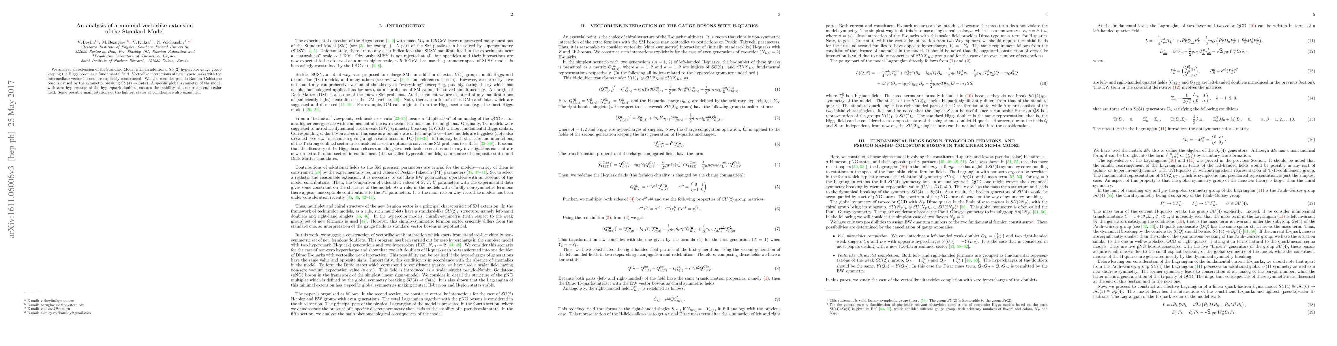 We analyze an extension of the Standard Model with an additional SU(2) hypercolor gauge group keeping the Higgs boson as a fundamental field. Vectorlike interactions of new hyperquarks with the intermediate vector bosons are explicitly constructed. We also consider pseudo-Nambu--Goldstone bosons caused by the symmetry breaking SU(4)-> Sp(4). A specific global symmetry of the model with zero hypercharge of the hyperquark doublets ensures the stability of a neutral pseudoscalar field. Some possible manifestations of the lightest states at colliders are also examined.