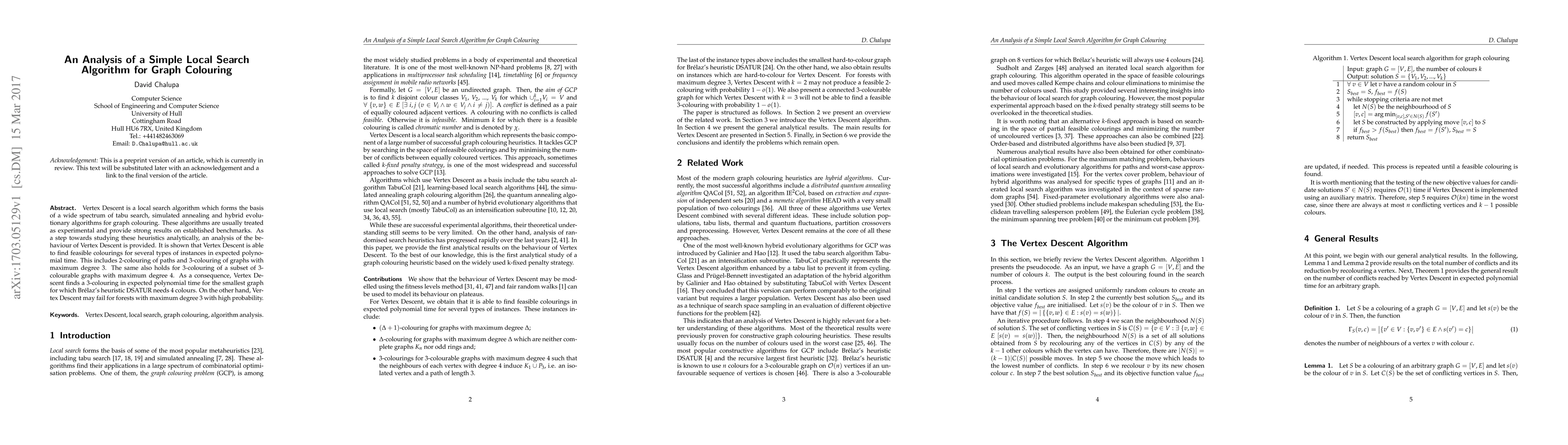 Vertex Descent is a local search algorithm which forms the basis of a wide spectrum of tabu search, simulated annealing and hybrid evolutionary algorithms for graph colouring. These algorithms are usually treated as experimental and provide strong results on established benchmarks. As a step towards studying these heuristics analytically, an analysis of the behaviour of Vertex Descent is provided. It is shown that Vertex Descent is able to find feasible colourings for several types of instances in expected polynomial time. This includes 2-colouring of paths and 3-colouring of graphs with maximum degree 3. The same also holds for 3-colouring of a subset of 3-colourable graphs with maximum degree 4. As a consequence, Vertex Descent finds a 3-colouring in expected polynomial time for the smallest graph for which Br\'elaz's heuristic DSATUR needs 4 colours. On the other hand, Vertex Descent may fail for forests with maximum degree 3 with high probability.