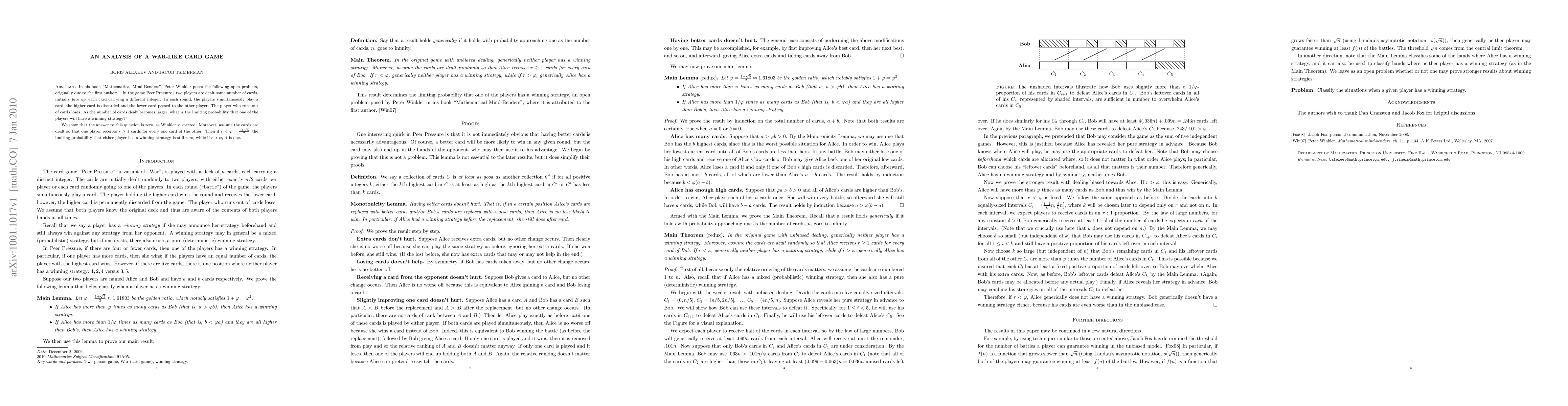 Researchers analyze a war-like card game called Peer Pressure, finding that one player having a winning strategy is impossible with an equal number of cards (r < phi), but possible if the other has more cards (r > phi).