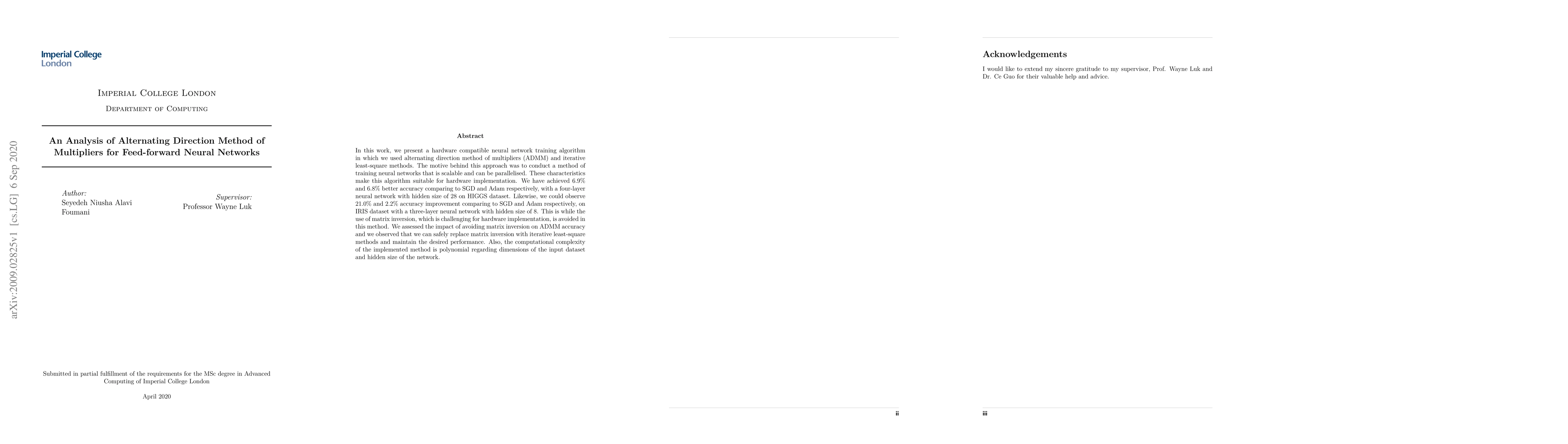 In this work, we present a hardware compatible neural network training algorithm in which we used alternating direction method of multipliers (ADMM) and iterative least-square methods. The motive behind this approach was to conduct a method of training neural networks that is scalable and can be parallelised. These characteristics make this algorithm suitable for hardware implementation. We have achieved 6.9\% and 6.8\% better accuracy comparing to SGD and Adam respectively, with a four-layer neural network with hidden size of 28 on HIGGS dataset. Likewise, we could observe 21.0\% and 2.2\% accuracy improvement comparing to SGD and Adam respectively, on IRIS dataset with a three-layer neural network with hidden size of 8. This is while the use of matrix inversion, which is challenging for hardware implementation, is avoided in this method. We assessed the impact of avoiding matrix inversion on ADMM accuracy and we observed that we can safely replace matrix inversion with iterative least-square methods and maintain the desired performance. Also, the computational complexity of the implemented method is polynomial regarding dimensions of the input dataset and hidden size of the network.