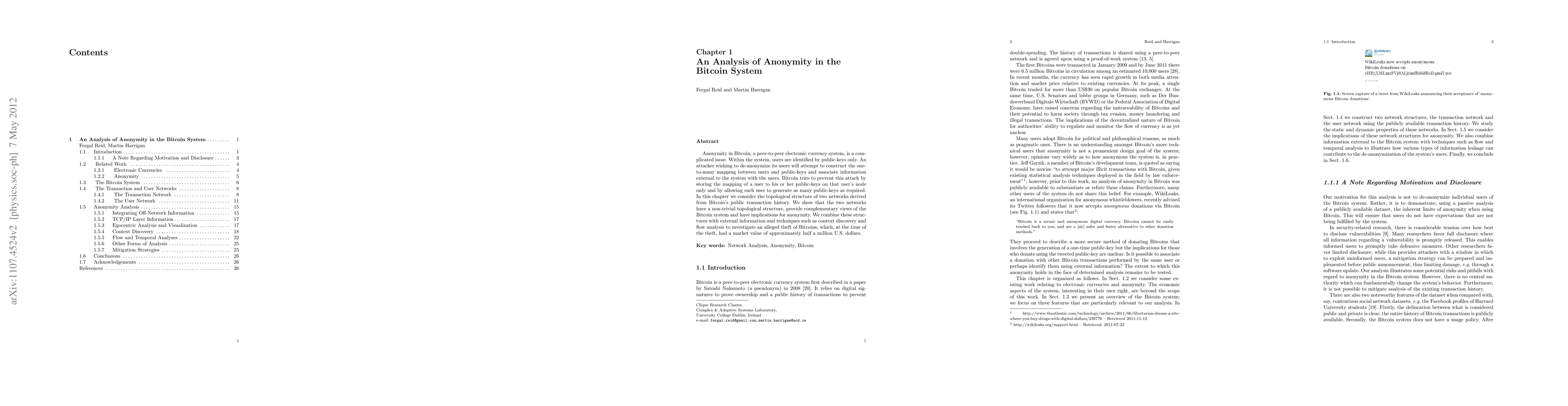 Anonymity in Bitcoin, a peer-to-peer electronic currency system, is a complicated issue. Within the system, users are identified by public-keys only. An attacker wishing to de-anonymize its users will attempt to construct the one-to-many mapping between users and public-keys and associate information external to the system with the users. Bitcoin tries to prevent this attack by storing the mapping of a user to his or her public-keys on that user's node only and by allowing each user to generate as many public-keys as required. In this chapter we consider the topological structure of two networks derived from Bitcoin's public transaction history. We show that the two networks have a non-trivial topological structure, provide complementary views of the Bitcoin system and have implications for anonymity. We combine these structures with external information and techniques such as context discovery and flow analysis to investigate an alleged theft of Bitcoins, which, at the time of the theft, had a market value of approximately half a million U.S. dollars.