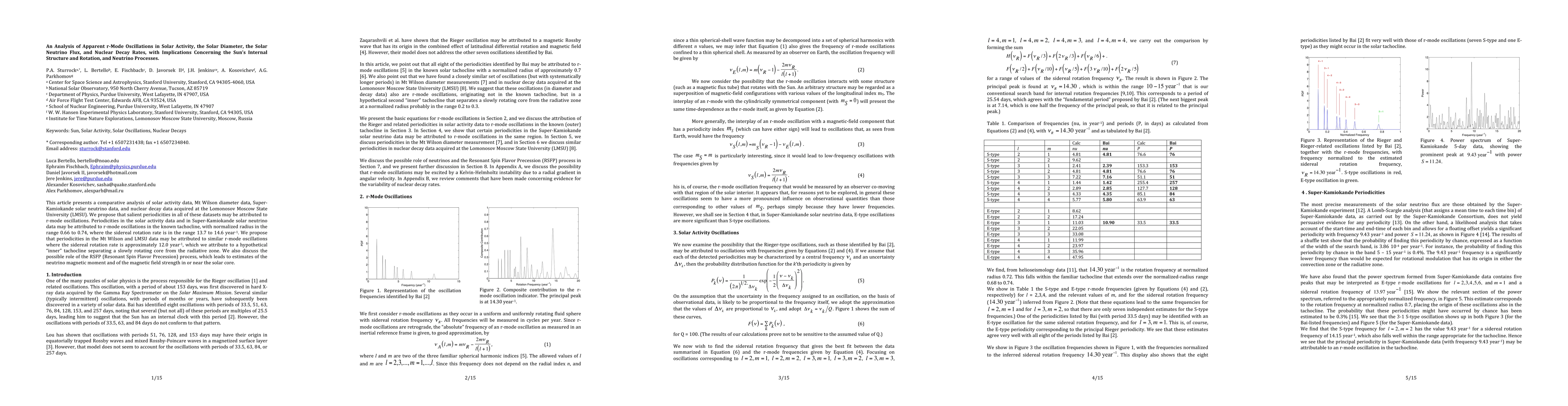 This article presents a comparative analysis of solar activity data, Mt Wilson diameter data, Super-Kamiokande solar neutrino data, and nuclear decay data acquired at the Lomonosov Moscow State University (LMSU). We propose that salient periodicities in all of these datasets may be attributed to r-mode oscillations. Periodicities in the solar activity data and in Super-Kamiokande solar neutrino data may be attributed to r-mode oscillations in the known tachocline, with normalized radius in the range 0.66 to 0.74, where the sidereal rotation rate is in the range 13.7 to 14.6 year-1. We propose that periodicities in the Mt Wilson and LMSU data may be attributed to similar r-mode oscillations where the sidereal rotation rate is approximately which we attribute to a hypothetical inner tachocline separating a slowly rotating core from the radiative zone. We also discuss the possible role of the RSFP (Resonant Spin Flavor Precession) process, which leads to estimates of the neutrino magnetic moment and of the magnetic field strength in or near the solar core.