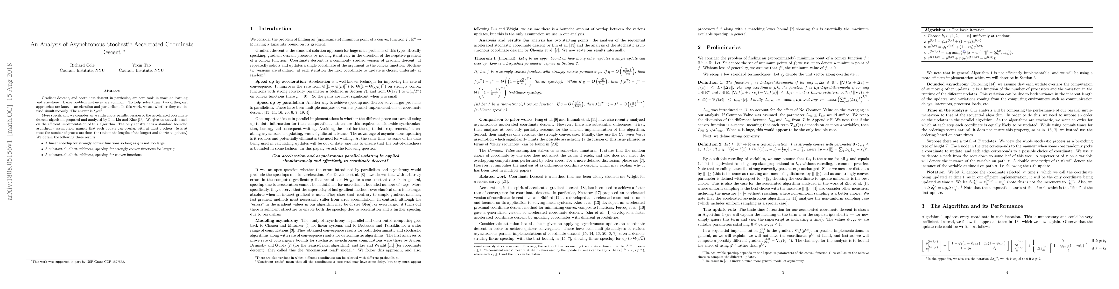 This paper analyzes an asynchronous parallel version of accelerated coordinate descent, demonstrating linear speedup for strongly convex functions under certain conditions, and sublinear speedups for both strongly convex and general convex functions, under a bounded asynchrony assumption.