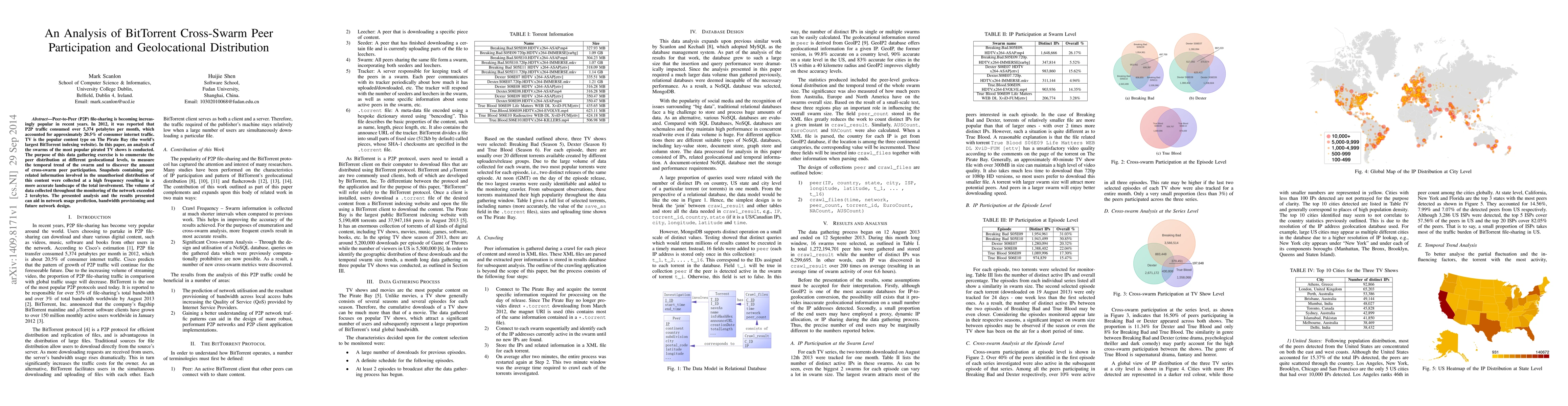 This paper analyzes BitTorrent swarms for popular pirated TV shows to map peer distribution by geolocation, track temporal trends, and measure cross-swarm peer participation. The study's extensive data collection, exceeding 2 terabytes, provides valuable insights for network usage prediction and future network design.
