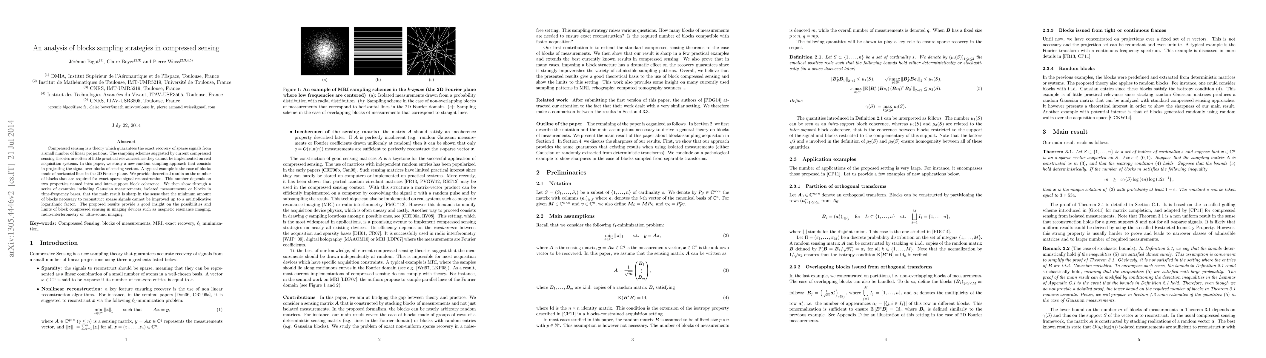 Compressed sensing is a theory which guarantees the exact recovery of sparse signals from a small number of linear projections. The sampling schemes suggested by current compressed sensing theories are often of little practical relevance since they cannot be implemented on real acquisition systems. In this paper, we study a new random sampling approach that consists in projecting the signal over blocks of sensing vectors. A typical example is the case of blocks made of horizontal lines in the 2D Fourier plane. We provide theoretical results on the number of blocks that are required for exact sparse signal reconstruction. This number depends on two properties named intra and inter-support block coherence. We then show through a series of examples including Gaussian measurements, isolated measurements or blocks in time-frequency bases, that the main result is sharp in the sense that the minimum amount of blocks necessary to reconstruct sparse signals cannot be improved up to a multiplicative logarithmic factor. The proposed results provide a good insight on the possibilities and limits of block compressed sensing in imaging devices such as magnetic resonance imaging, radio-interferometry or ultra-sound imaging.