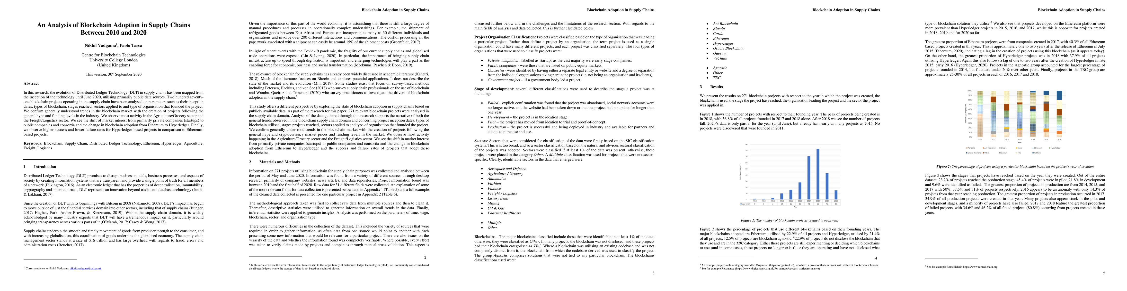 This research analyzes 271 blockchain projects in supply chains from 2010 to 2020, noting trends in adoption, sectors, and project success. It highlights a shift from Ethereum to Hyperledger and observes higher success rates for Hyperledger projects.