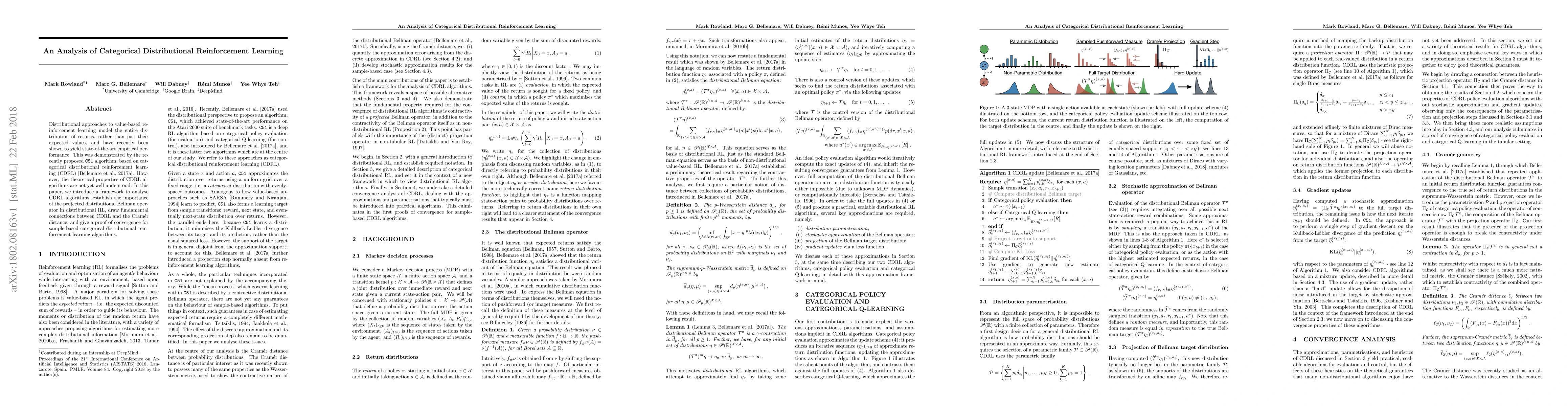 This paper develops a theoretical framework to analyze categorical distributional reinforcement learning (CDRL) algorithms, highlighting the significance of the projected distributional Bellman operator and establishing connections to the Cramér distance. The authors provide a proof of convergence for sample-based CDRL algorithms.