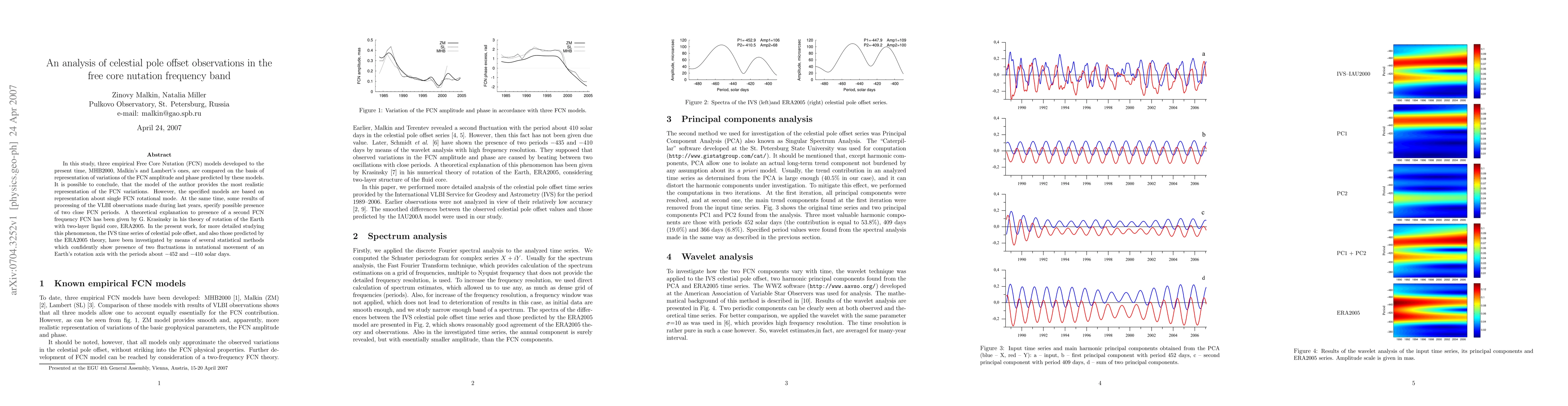 In this study, three empirical Free Core Nutation (FCN) models developed to the present time, MHB2000, Malkin's and Lambert's ones, are compared on the basis of representation of variations of the FCN amplitude and phase predicted by these models. It is possible to conclude, that the model of the author provides the most realistic representation of the FCN variations. However, the specified models are based on representation about single FCN rotational mode. At the same time, some results of processing of the VLBI observations made during last years, specify possible presence of two close FCN periods. A theoretical explanation to presence of a second FCN frequency FCN has been given by G. Krasinsky in his theory of rotation of the Earth with two-layer liquid core, ERA2005. In the present work, for more detailed studying this phenomenon, the IVS time series of celestial pole offset, and also those predicted by the ERA2005 theory, have been investigated by means of several statistical methods which confidently show presence of two fluctuations in nutational movement of an Earth's rotation axis with the periods about -452 and -410 solar days.