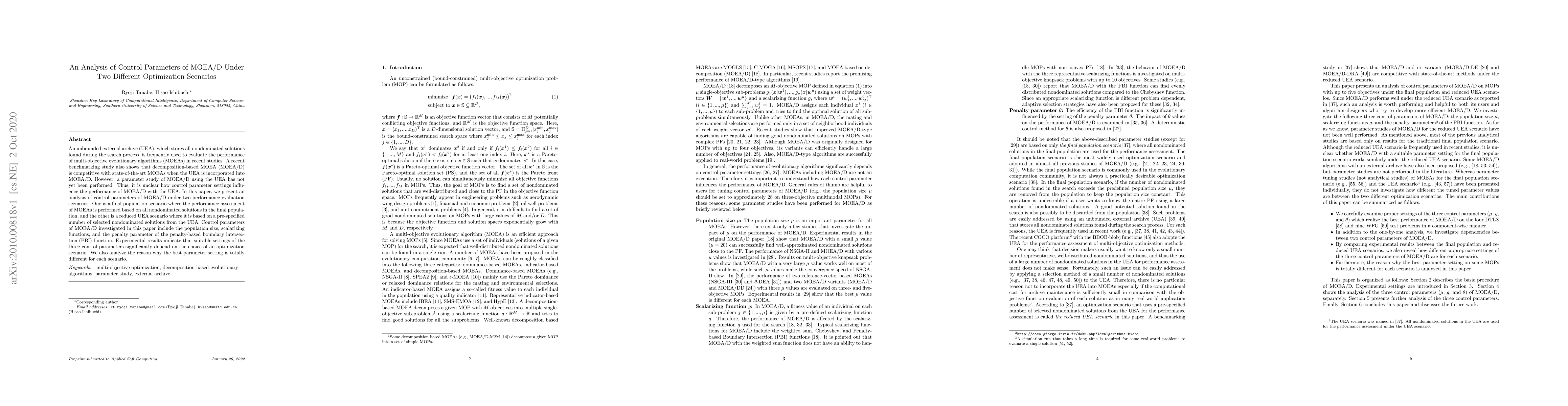 An unbounded external archive (UEA), which stores all nondominated solutions found during the search process, is frequently used to evaluate the performance of multi-objective evolutionary algorithms (MOEAs) in recent studies. A recent benchmarking study also shows that decomposition-based MOEA (MOEA/D) is competitive with state-of-the-art MOEAs when the UEA is incorporated into MOEA/D. However, a parameter study of MOEA/D using the UEA has not yet been performed. Thus, it is unclear how control parameter settings influence the performance of MOEA/D with the UEA. In this paper, we present an analysis of control parameters of MOEA/D under two performance evaluation scenarios. One is a final population scenario where the performance assessment of MOEAs is performed based on all nondominated solutions in the final population, and the other is a reduced UEA scenario where it is based on a pre-specified number of selected nondominated solutions from the UEA. Control parameters of MOEA/D investigated in this paper include the population size, scalarizing functions, and the penalty parameter of the penalty-based boundary intersection (PBI) function. Experimental results indicate that suitable settings of the three control parameters significantly depend on the choice of an optimization scenario. We also analyze the reason why the best parameter setting is totally different for each scenario.