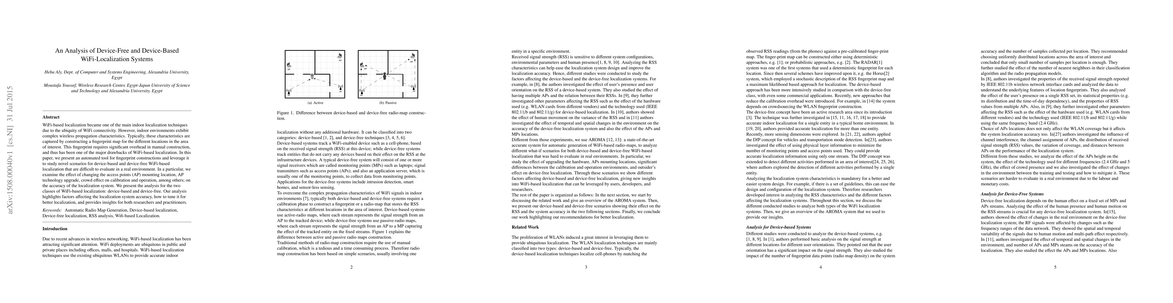 This paper investigates automated fingerprint construction for WiFi-based localization, comparing device-based and device-free approaches. It examines factors like access point placement and upgrades, crowd effects, and provides insights to enhance localization accuracy.