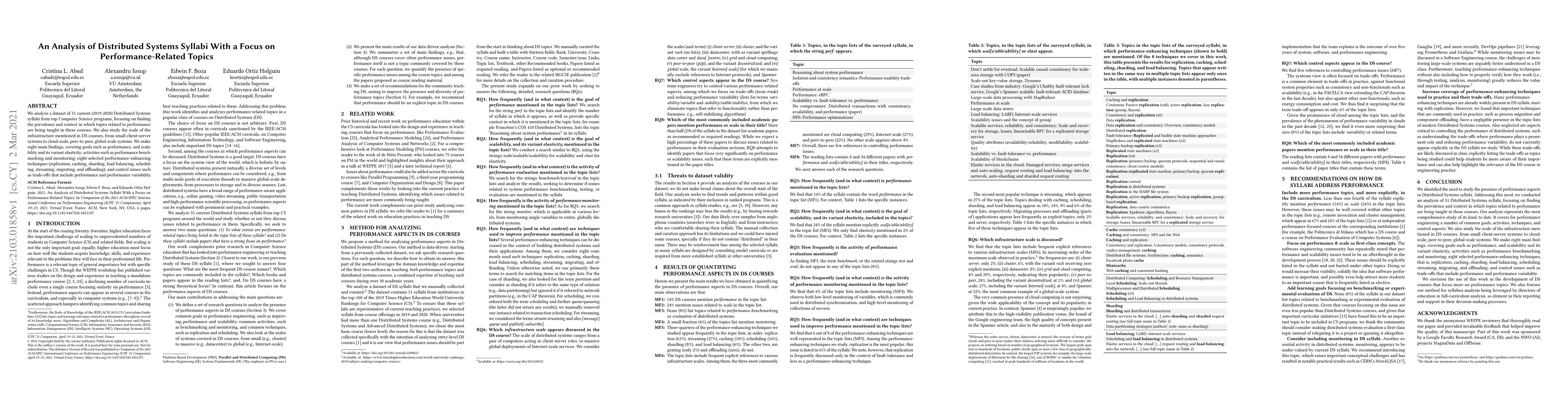 This paper analyzes 51 Distributed Systems syllabi from top Computer Science programs, focusing on the prevalence of performance-related topics and the scale of infrastructure discussed. It identifies eight main findings on performance, scalability, benchmarking, and various performance-enhancing techniques.