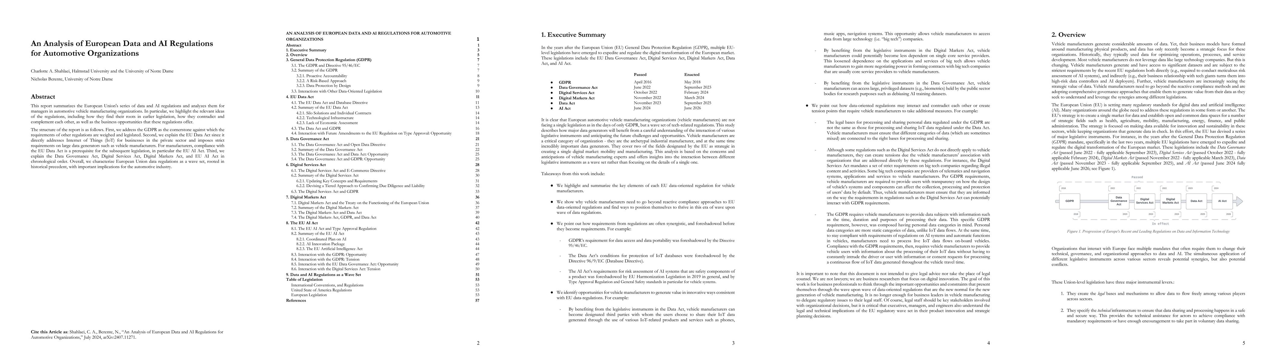 This report analyzes European Union regulations on data and AI, focusing on their implications for automotive manufacturers. It highlights the GDPR as a foundational regulation, discusses the EU Data Act's strict requirements for large data generators, and outlines subsequent acts like the EU AI Act, emphasizing their business opportunities and compliance necessities.