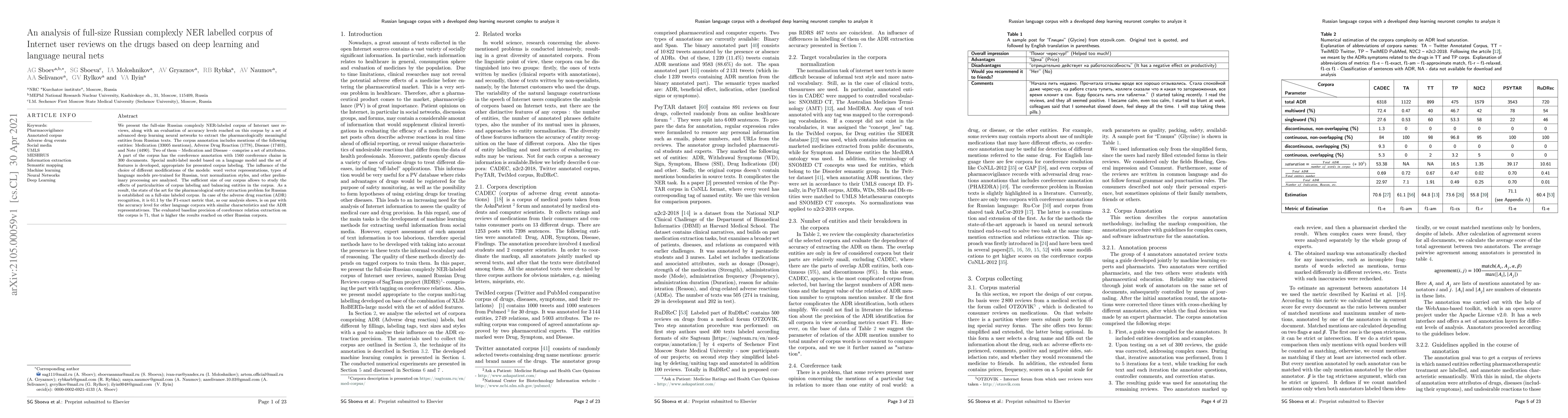 We present the full-size Russian complexly NER-labeled corpus of Internet user reviews, along with an evaluation of accuracy levels reached on this corpus by a set of advanced deep learning neural networks to extract the pharmacologically meaningful entities from Russian texts. The corpus annotation includes mentions of the following entities: Medication (33005 mentions), Adverse Drug Reaction (1778), Disease (17403), and Note (4490). Two of them - Medication and Disease - comprise a set of attributes. A part of the corpus has the coreference annotation with 1560 coreference chains in 300 documents. Special multi-label model based on a language model and the set of features is developed, appropriate for presented corpus labeling. The influence of the choice of different modifications of the models: word vector representations, types of language models pre-trained for Russian, text normalization styles, and other preliminary processing are analyzed. The sufficient size of our corpus allows to study the effects of particularities of corpus labeling and balancing entities in the corpus. As a result, the state of the art for the pharmacological entity extraction problem for Russian is established on a full-size labeled corpus. In case of the adverse drug reaction (ADR) recognition, it is 61.1 by the F1-exact metric that, as our analysis shows, is on par with the accuracy level for other language corpora with similar characteristics and the ADR representativnes. The evaluated baseline precision of coreference relation extraction on the corpus is 71, that is higher the results reached on other Russian corpora.