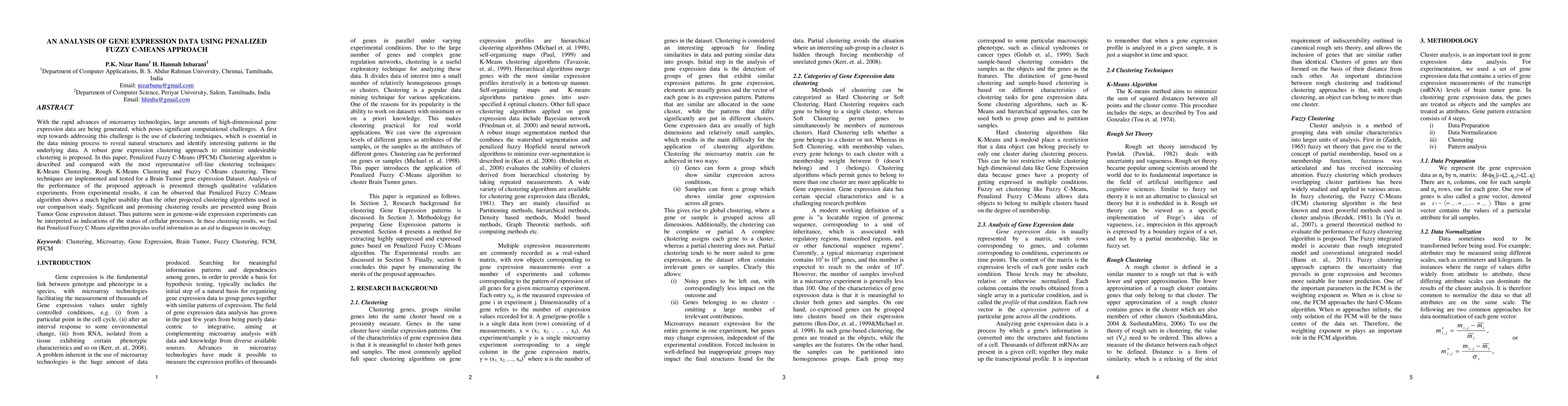With the rapid advances of microarray technologies, large amounts of high-dimensional gene expression data are being generated, which poses significant computational challenges. A first step towards addressing this challenge is the use of clustering techniques, which is essential in the data mining process to reveal natural structures and identify interesting patterns in the underlying data. A robust gene expression clustering approach to minimize undesirable clustering is proposed. In this paper, Penalized Fuzzy C-Means (PFCM) Clustering algorithm is described and compared with the most representative off-line clustering techniques: K-Means Clustering, Rough K-Means Clustering and Fuzzy C-Means clustering. These techniques are implemented and tested for a Brain Tumor gene expression Dataset. Analysis of the performance of the proposed approach is presented through qualitative validation experiments. From experimental results, it can be observed that Penalized Fuzzy C-Means algorithm shows a much higher usability than the other projected clustering algorithms used in our comparison study. Significant and promising clustering results are presented using Brain Tumor Gene expression dataset. Thus patterns seen in genome-wide expression experiments can be interpreted as indications of the status of cellular processes. In these clustering results, we find that Penalized Fuzzy C-Means algorithm provides useful information as an aid to diagnosis in oncology.