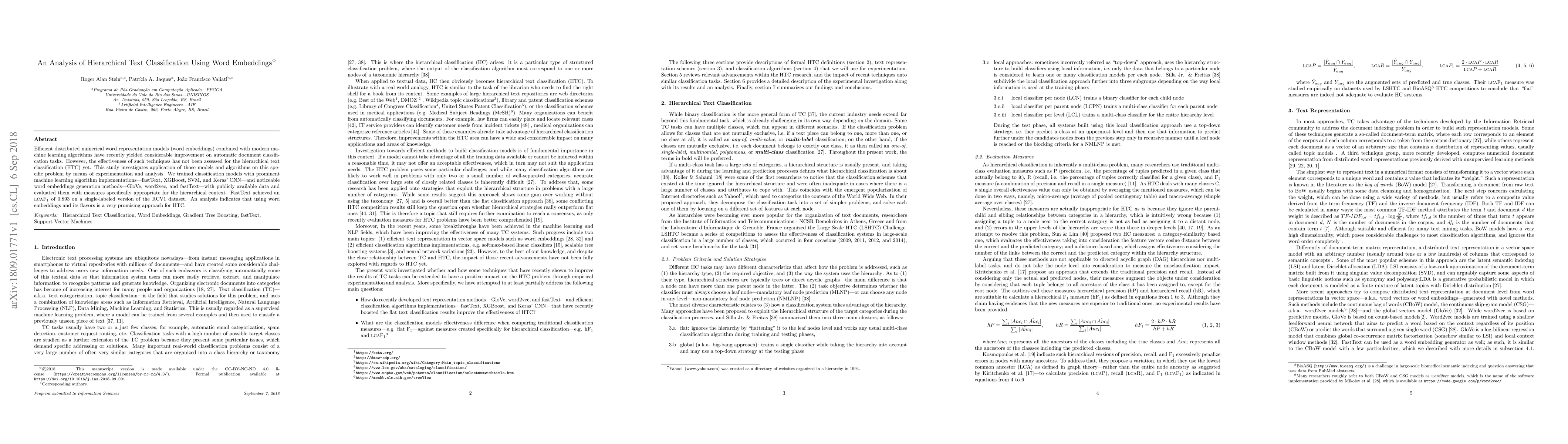 This study explores the efficacy of word embeddings and machine learning algorithms for hierarchical text classification, finding that fastText combined with XGBoost achieved a high LCA F1 score of 0.893 on the RCV1 dataset, demonstrating the potential of word embeddings in hierarchical contexts.