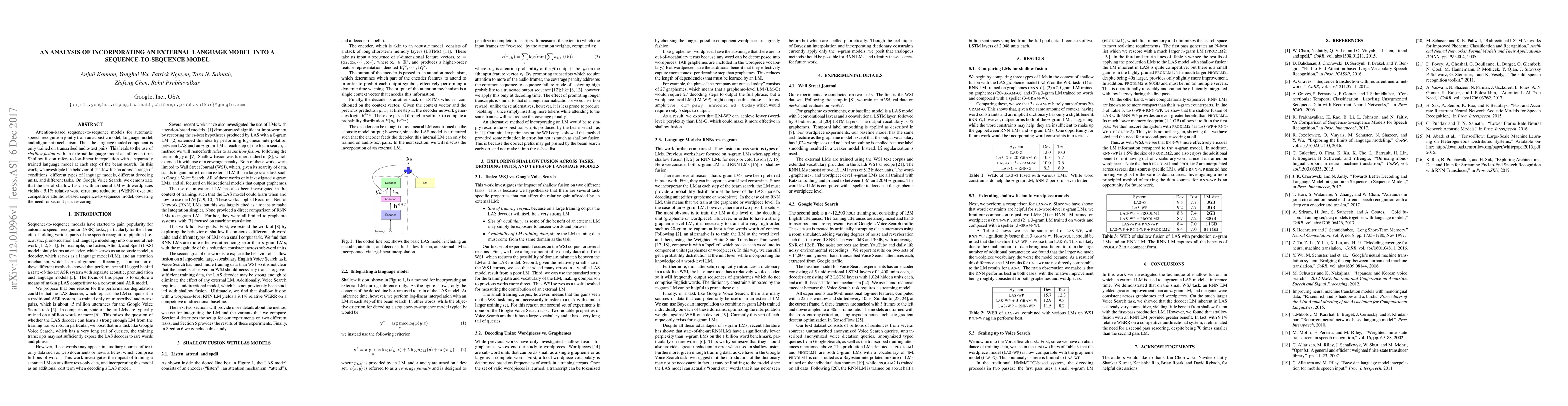 Attention-based sequence-to-sequence models for automatic speech recognition jointly train an acoustic model, language model, and alignment mechanism. Thus, the language model component is only trained on transcribed audio-text pairs. This leads to the use of shallow fusion with an external language model at inference time. Shallow fusion refers to log-linear interpolation with a separately trained language model at each step of the beam search. In this work, we investigate the behavior of shallow fusion across a range of conditions: different types of language models, different decoding units, and different tasks. On Google Voice Search, we demonstrate that the use of shallow fusion with a neural LM with wordpieces yields a 9.1% relative word error rate reduction (WERR) over our competitive attention-based sequence-to-sequence model, obviating the need for second-pass rescoring.