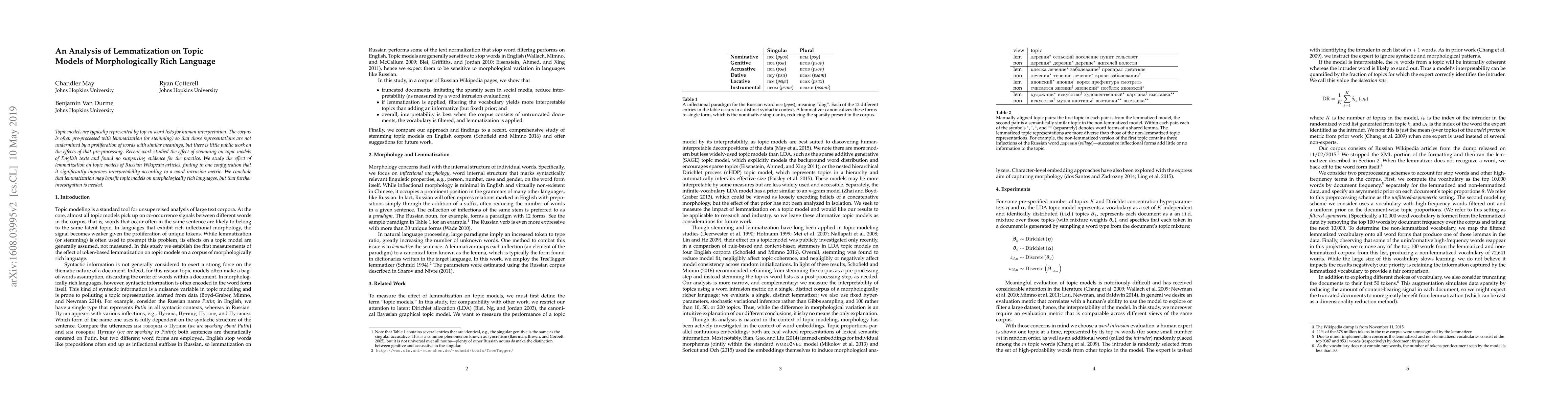 Topic models are typically represented by top-$m$ word lists for human interpretation. The corpus is often pre-processed with lemmatization (or stemming) so that those representations are not undermined by a proliferation of words with similar meanings, but there is little public work on the effects of that pre-processing. Recent work studied the effect of stemming on topic models of English texts and found no supporting evidence for the practice. We study the effect of lemmatization on topic models of Russian Wikipedia articles, finding in one configuration that it significantly improves interpretability according to a word intrusion metric. We conclude that lemmatization may benefit topic models on morphologically rich languages, but that further investigation is needed.