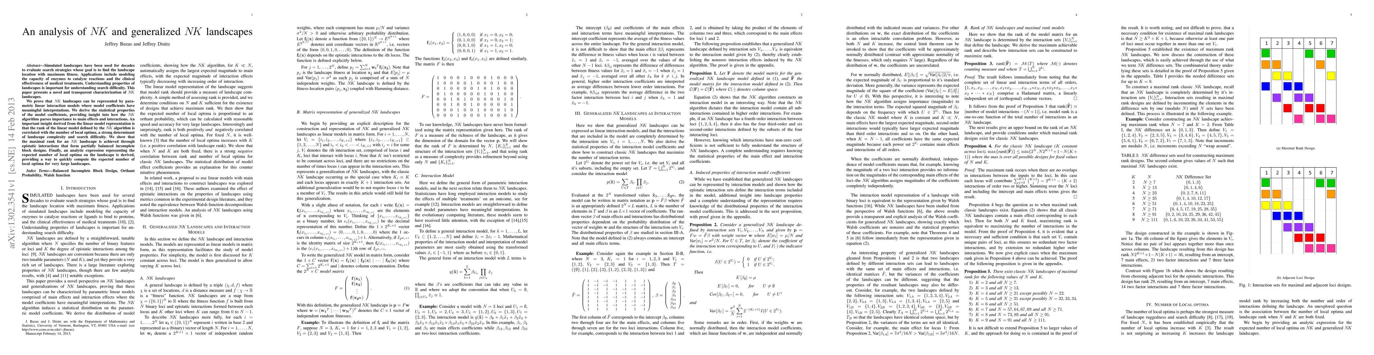 Simulated landscapes have been used for decades to evaluate search strategies whose goal is to find the landscape location with maximum fitness. Applications include modeling the capacity of enzymes to catalyze reactions and the clinical effectiveness of medical treatments. Understanding properties of landscapes is important for understanding search difficulty. This paper presents a novel and transparent characterization of NK landscapes. We prove that NK landscapes can be represented by parametric linear interaction models where model coefficients have meaningful interpretations. We derive the statistical properties of the model coefficients, providing insight into how the NK algorithm parses importance to main effects and interactions. An important insight derived from the linear model representation is that the rank of the linear model defined by the NK algorithm is correlated with the number of local optima, a strong determinant of landscape complexity and search difficulty. We show that the maximal rank for an NK landscape is achieved through epistatic interactions that form partially balanced incomplete block designs. Finally, an analytic expression representing the expected number of local optima on the landscape is derived, providing a way to quickly compute the expected number of local optima for very large landscapes.