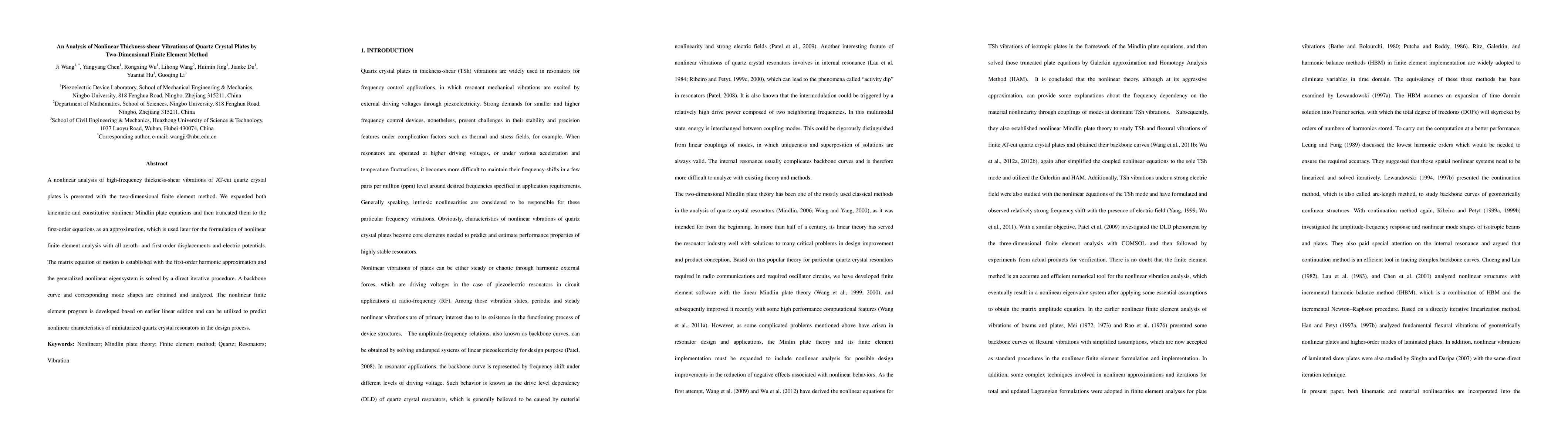 This paper presents a nonlinear analysis of high-frequency thickness-shear vibrations in AT-cut quartz crystal plates using a two-dimensional finite element method. The study develops a nonlinear finite element program to predict nonlinear characteristics of miniaturized quartz crystal resonators, providing a backbone curve and mode shapes for design purposes.
