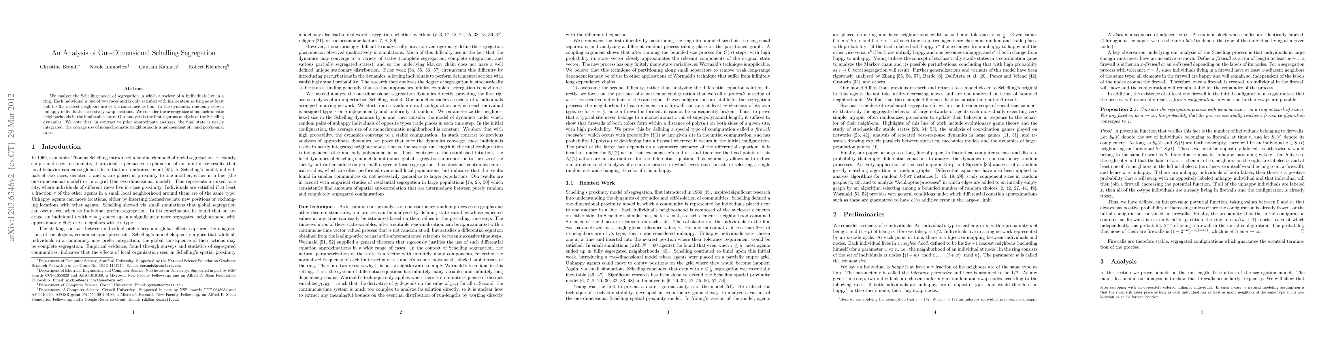 We analyze the Schelling model of segregation in which a society of n individuals live in a ring. Each individual is one of two races and is only satisfied with his location so long as at least half his 2w nearest neighbors are of the same race as him. In the dynamics, randomly-chosen unhappy individuals successively swap locations. We consider the average size of monochromatic neighborhoods in the final stable state. Our analysis is the first rigorous analysis of the Schelling dynamics. We note that, in contrast to prior approximate analyses, the final state is nearly integrated: the average size of monochromatic neighborhoods is independent of n and polynomial in w.