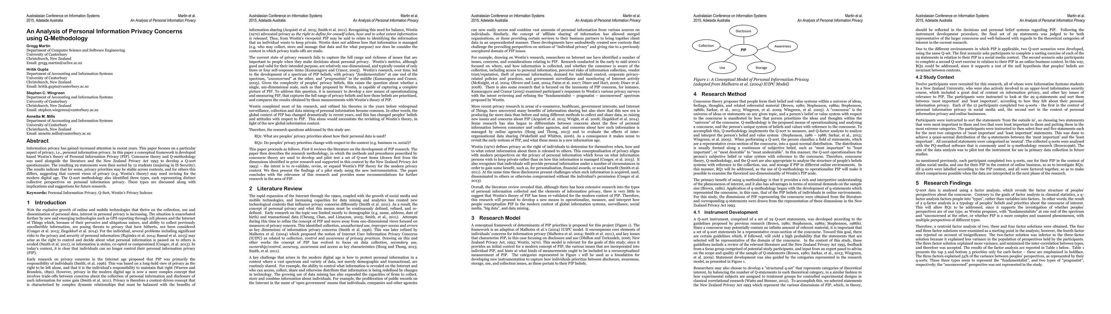 Researchers used Q-methodology to analyze personal information privacy concerns based on Westin's theory, finding that individual perspectives may vary across contexts, and suggesting a need for revising current views of privacy for the modern digital age.