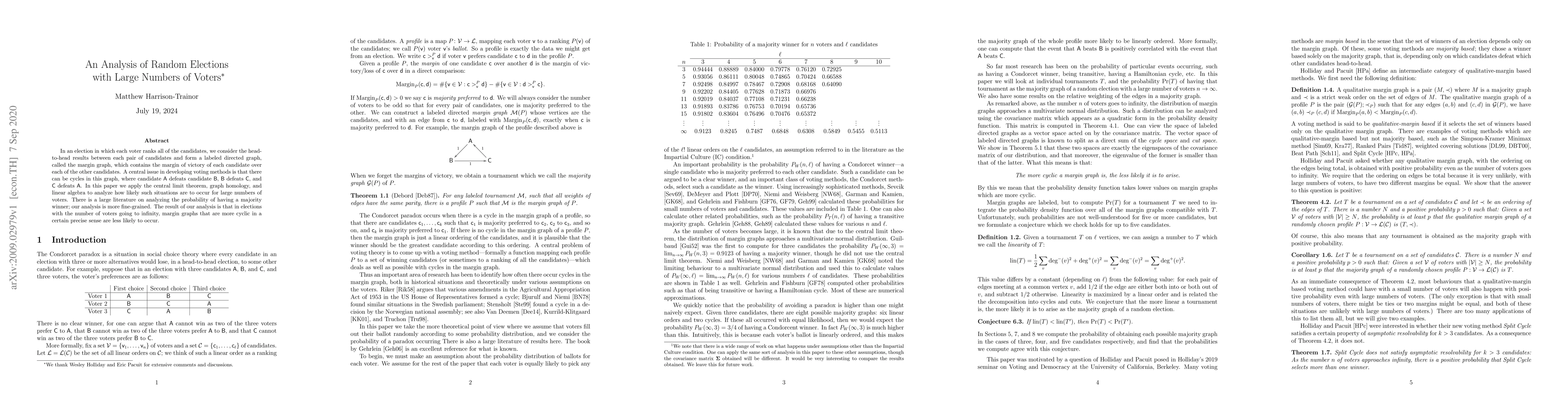 In an election in which each voter ranks all of the candidates, we consider the head-to-head results between each pair of candidates and form a labeled directed graph, called the margin graph, which contains the margin of victory of each candidate over each of the other candidates. A central issue in developing voting methods is that there can be cycles in this graph, where candidate $\mathsf{A}$ defeats candidate $\mathsf{B}$, $\mathsf{B}$ defeats $\mathsf{C}$, and $\mathsf{C}$ defeats $\mathsf{A}$. In this paper we apply the central limit theorem, graph homology, and linear algebra to analyze how likely such situations are to occur for large numbers of voters. There is a large literature on analyzing the probability of having a majority winner; our analysis is more fine-grained. The result of our analysis is that in elections with the number of voters going to infinity, margin graphs that are more cyclic in a certain precise sense are less likely to occur.