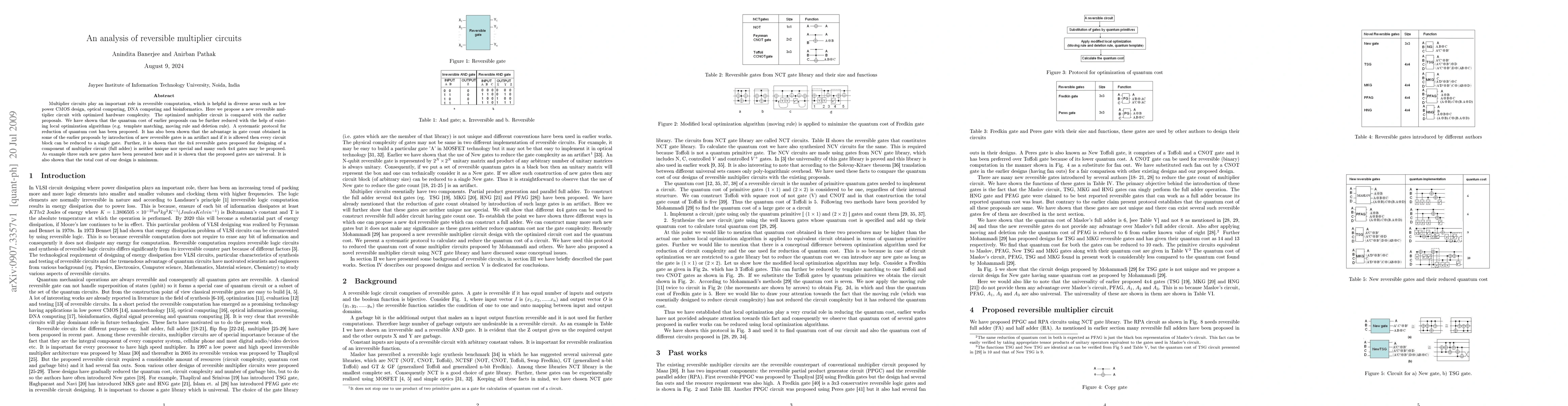 This paper introduces a new reversible multiplier circuit designed to minimize hardware complexity and quantum cost, comparing it favorably against earlier proposals. It demonstrates that the quantum cost can be further reduced using local optimization algorithms and argues that some earlier claims of reduced gate count through new reversible gates are artifacts.