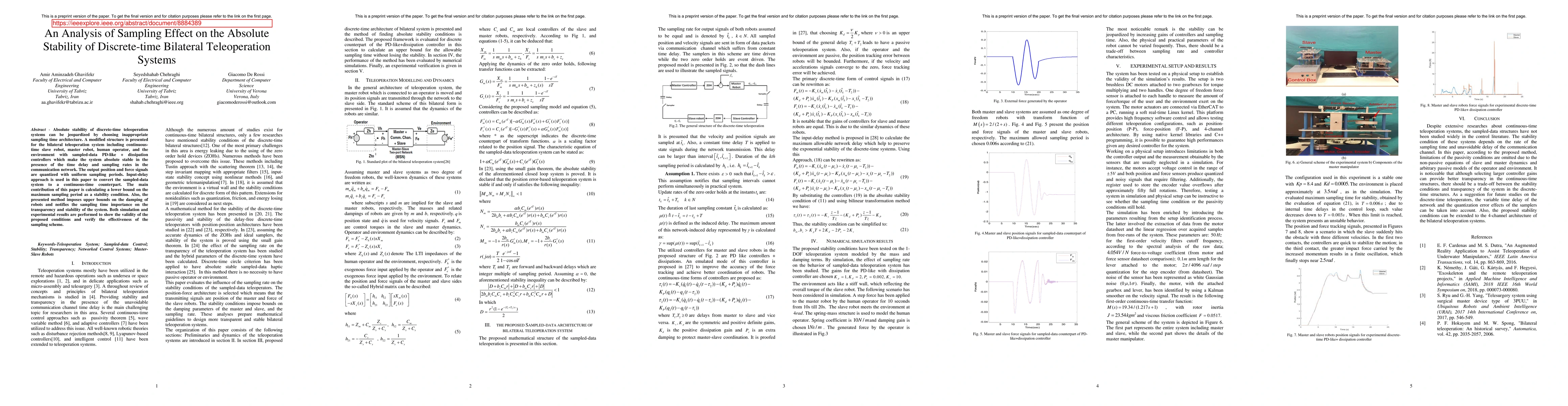 This paper investigates the impact of sampling time on the absolute stability of discrete-time bilateral teleoperation systems, proposing a modified structure with PD-like controllers. It establishes a lower bound on the maximum sampling period to ensure stability, emphasizing the importance of sampling time on system transparency and stability, validated through simulations and experiments.