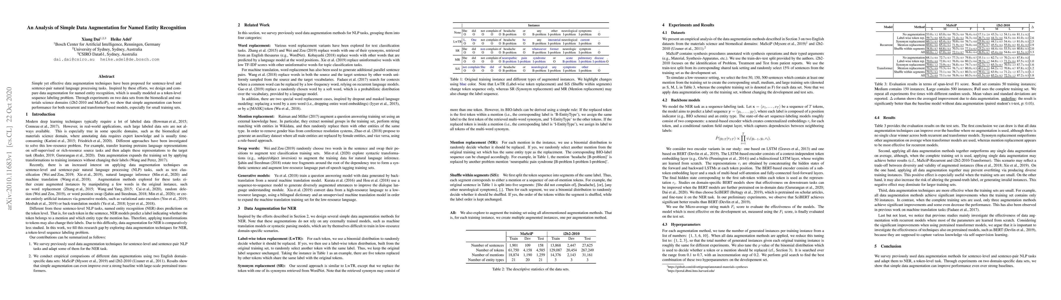 This paper investigates simple data augmentation techniques for named entity recognition, demonstrating improved performance for both recurrent and transformer models, particularly when training data is limited, through experiments on biomedical and materials science datasets.