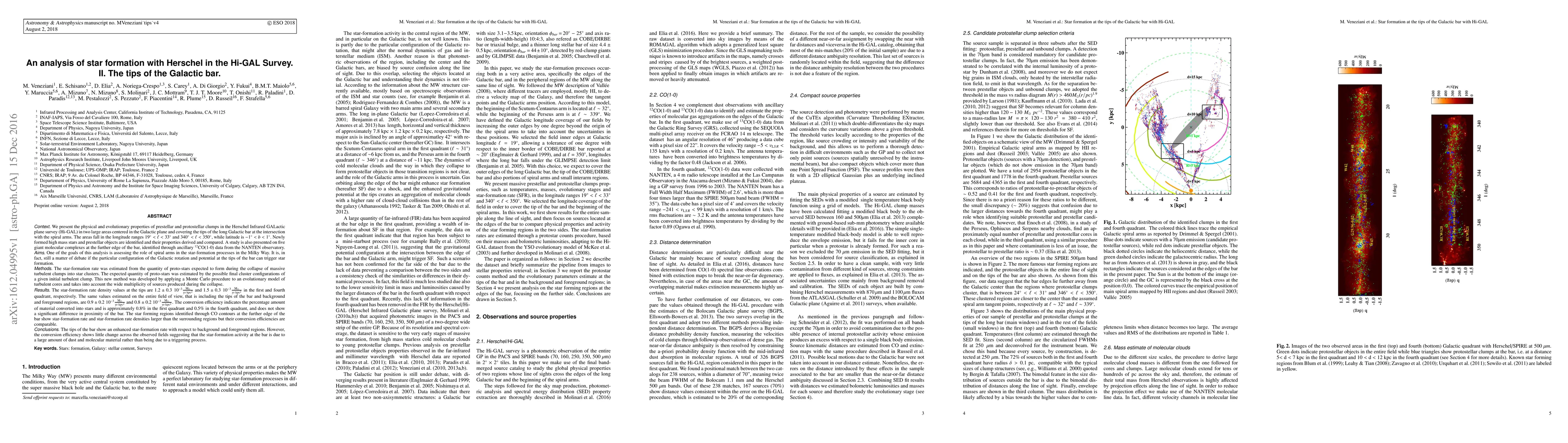 The research analyzes star formation in the Galactic bar tips using Herschel's Hi-GAL survey, identifying prestellar and protostellar clumps. A new method estimates star formation rates via turbulent core collapse models, finding similar rates at bar tips and overall field, with conversion efficiencies around 0.8% and 0.5% in respective quadrants. The findings suggest star formation at the bar results from abundant dust and molecular material, not triggering processes.