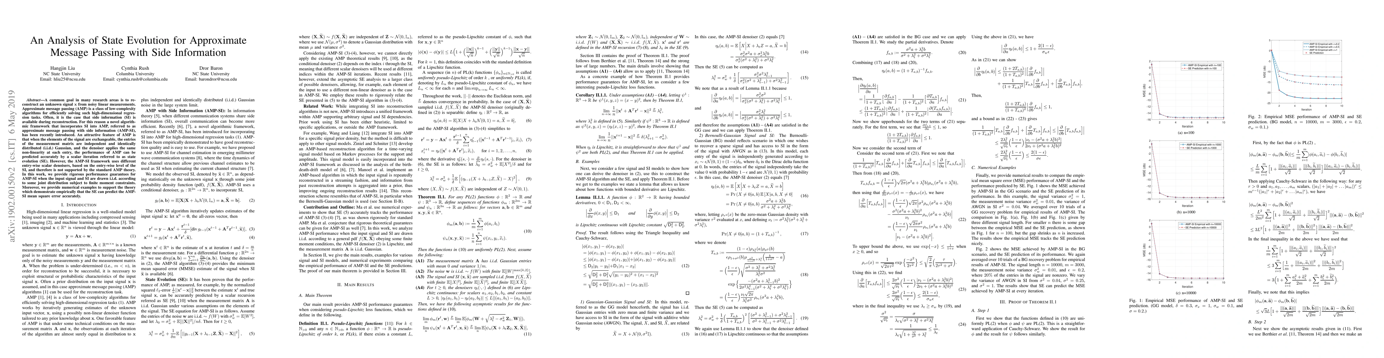 This paper analyzes the state evolution for approximate message passing with side information (AMP-SI), providing rigorous performance guarantees for its use in reconstructing signals from noisy measurements. It demonstrates that state evolution can accurately predict the AMP-SI mean square error, even when using different entry-wise denoisers based on the level of side information.