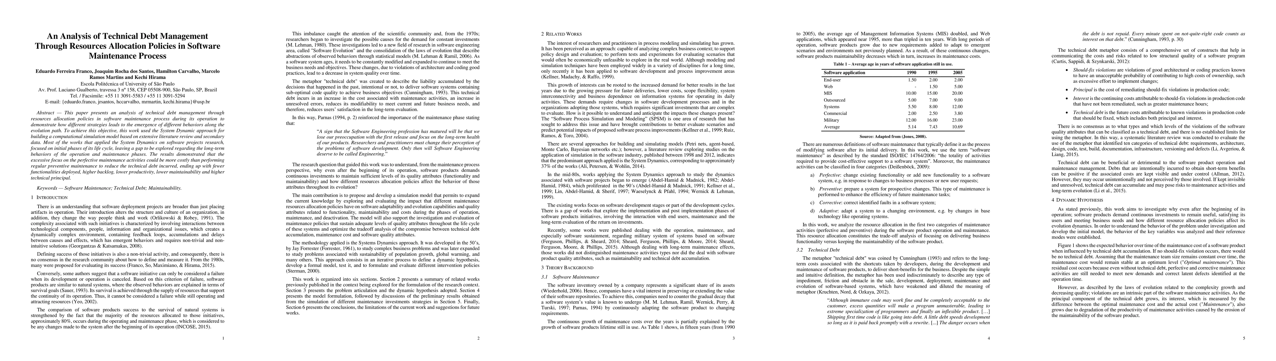 This paper analyzes technical debt management via resource allocation policies in software maintenance, using System Dynamics to simulate long-term behaviors. It finds that excessive focus on perfective maintenance can be more costly than regular preventive maintenance, leading to lower productivity and higher technical debt.