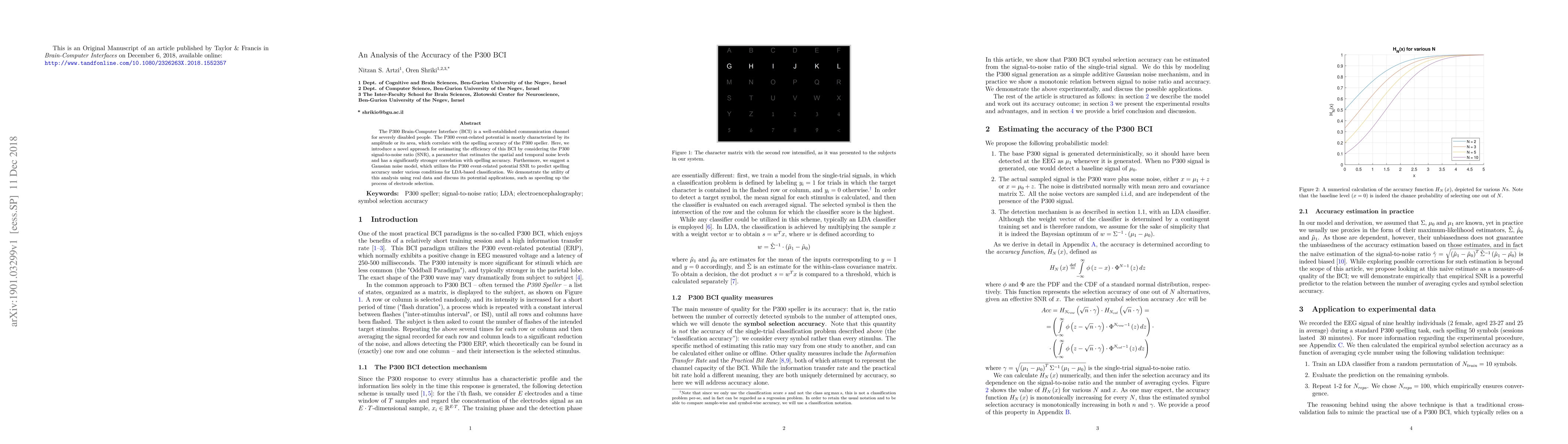 The research proposes a novel approach for estimating the efficiency of the P300 Brain-Computer Interface (BCI) by considering the P300 signal-to-noise ratio (SNR), which correlates more strongly with spelling accuracy than traditional methods. The study uses a Gaussian noise model to predict spelling accuracy under various conditions for Linear Discriminant Analysis (LDA)-based classification.