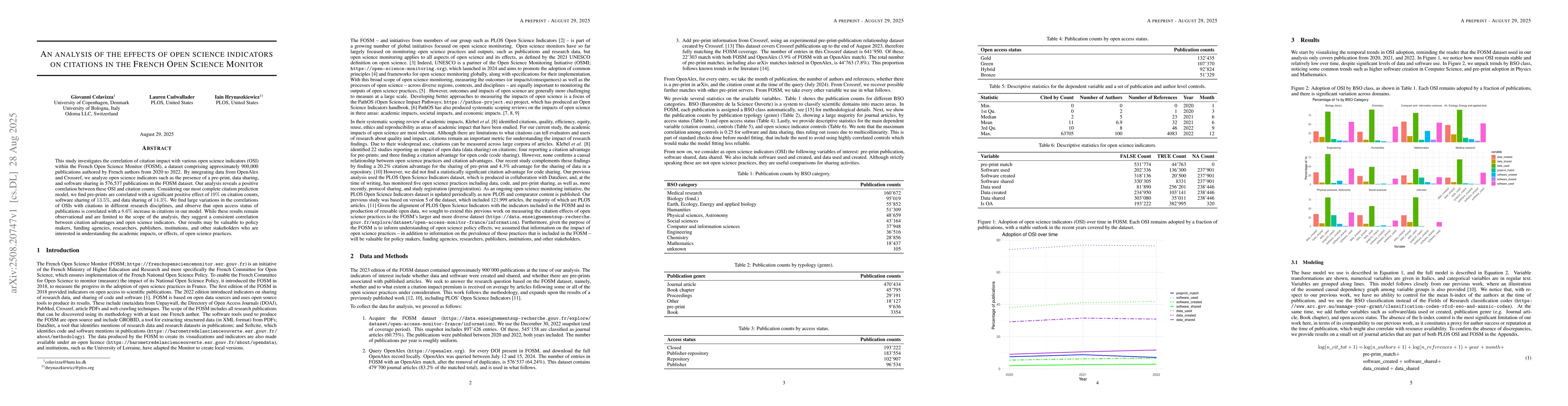 This study investigates the correlation of citation impact with various open science indicators (OSI) within the French Open Science Monitor (FOSM), a dataset comprising approximately 900,000 publications authored by French authors from 2020 to 2022. By integrating data from OpenAlex and Crossref, we analyze open science indicators such as the presence of a pre-print, data sharing, and software sharing in 576,537 publications in the FOSM dataset. Our analysis reveals a positive correlation between these OSI and citation counts. Considering our most complete citation prediction model, we find pre-prints are correlated with a significant positive effect of 19% on citation counts, software sharing of 13.5%, and data sharing of 14.3%. We find large variations in the correlations of OSIs with citations in different research disciplines, and observe that open access status of publications is correlated with a 8.6% increase in citations in our model. While these results remain observational and are limited to the scope of the analysis, they suggest a consistent correlation between citation advantages and open science indicators. Our results may be valuable to policy makers, funding agencies, researchers, publishers, institutions, and other stakeholders who are interested in understanding the academic impacts, or effects, of open science practices.